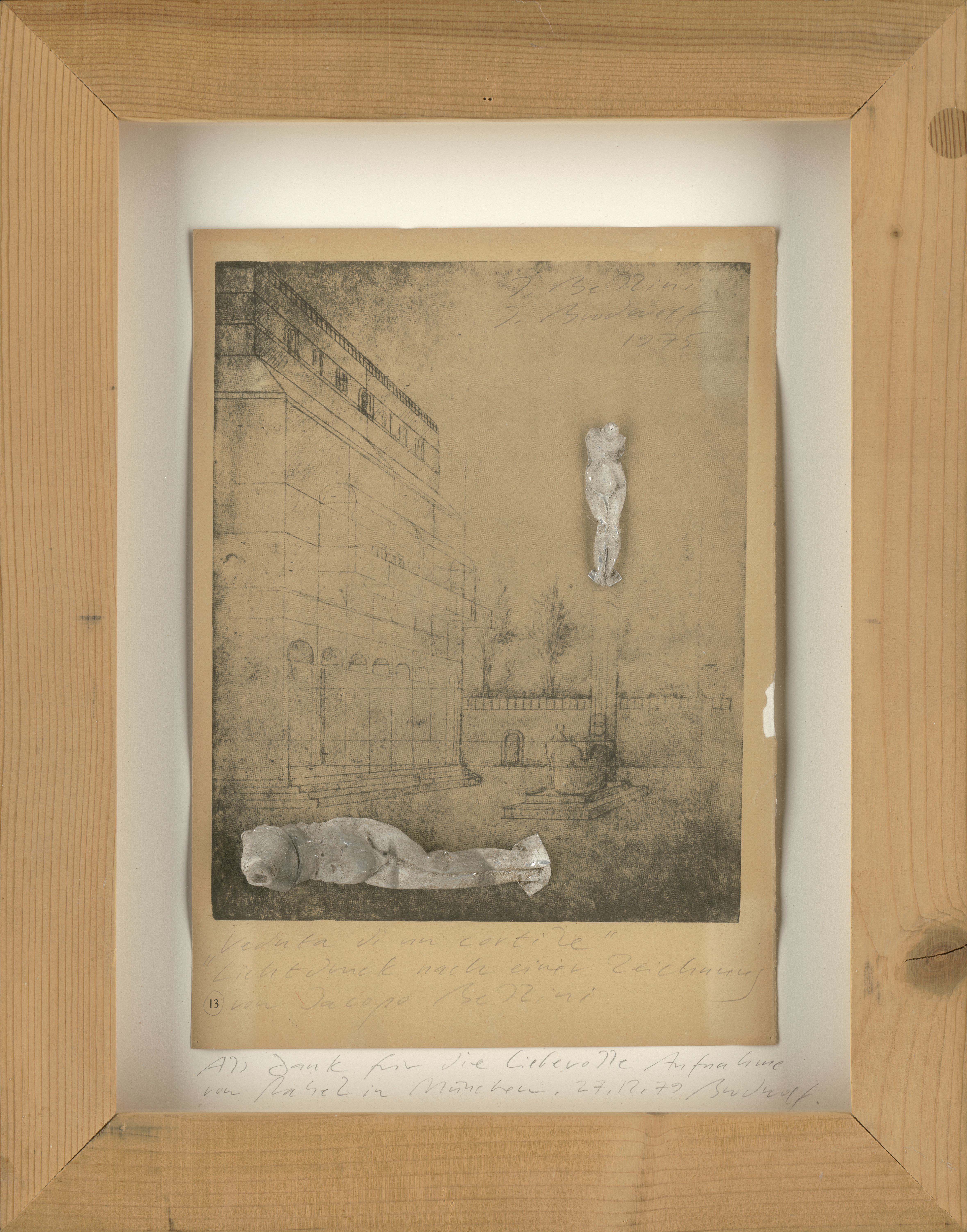Frühe, dunkeltonige und dichte Komposition des Künstlers in reduzierter Palette von Schwarz, Rot und Blau; zudem vorhanden eine seiner charakteristischen Vereinigungen von Druckgraphik (hier ein Druck nach Zeichnung von Bellini) und Tubenfiguren. Frühe Gemälde Brodwolfs sind selten.