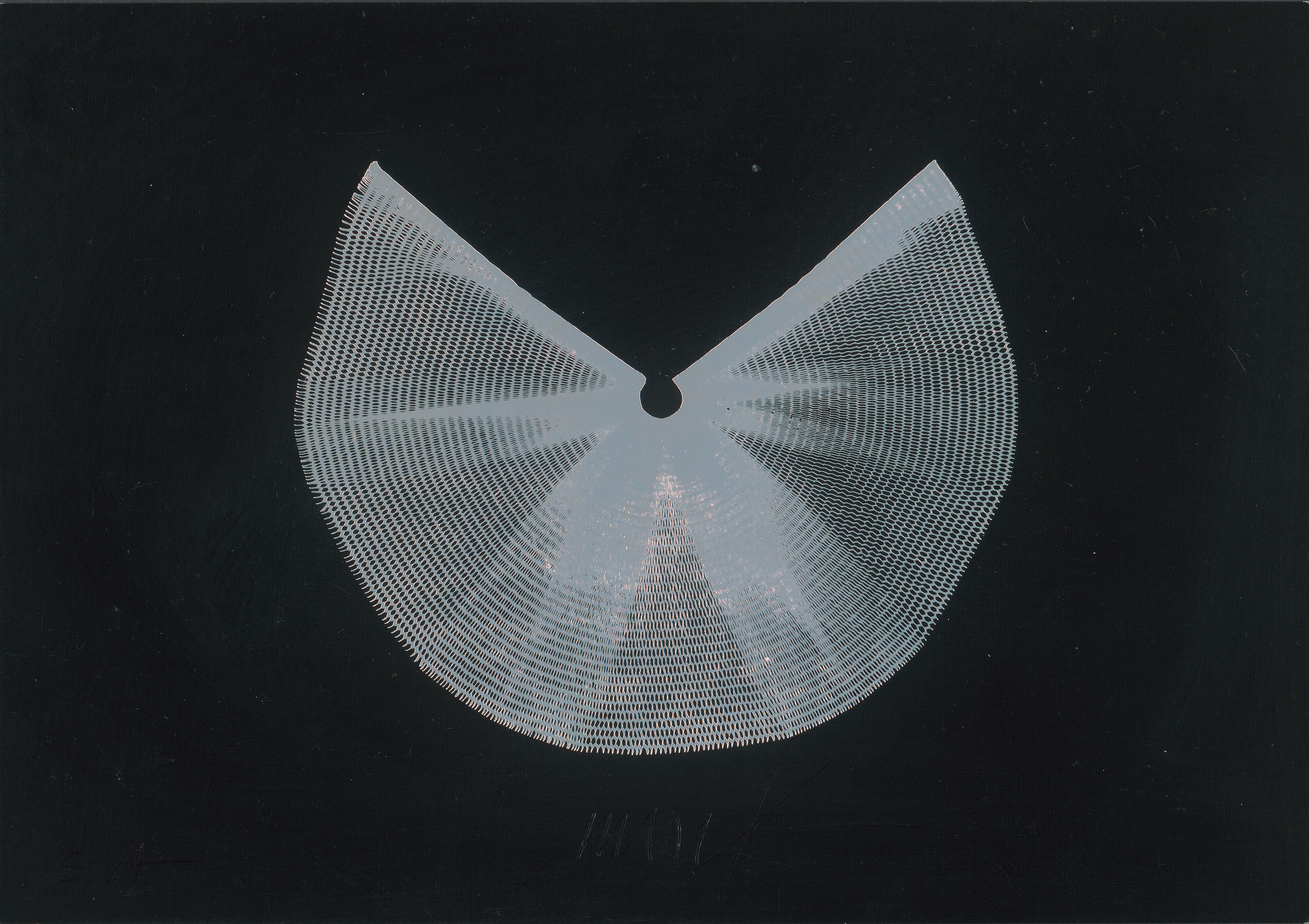 Heißfolien-Prägedruck in Silber und Serigraphie, auf schwarzen Chromoluxkarton aufgezogen. 1981.