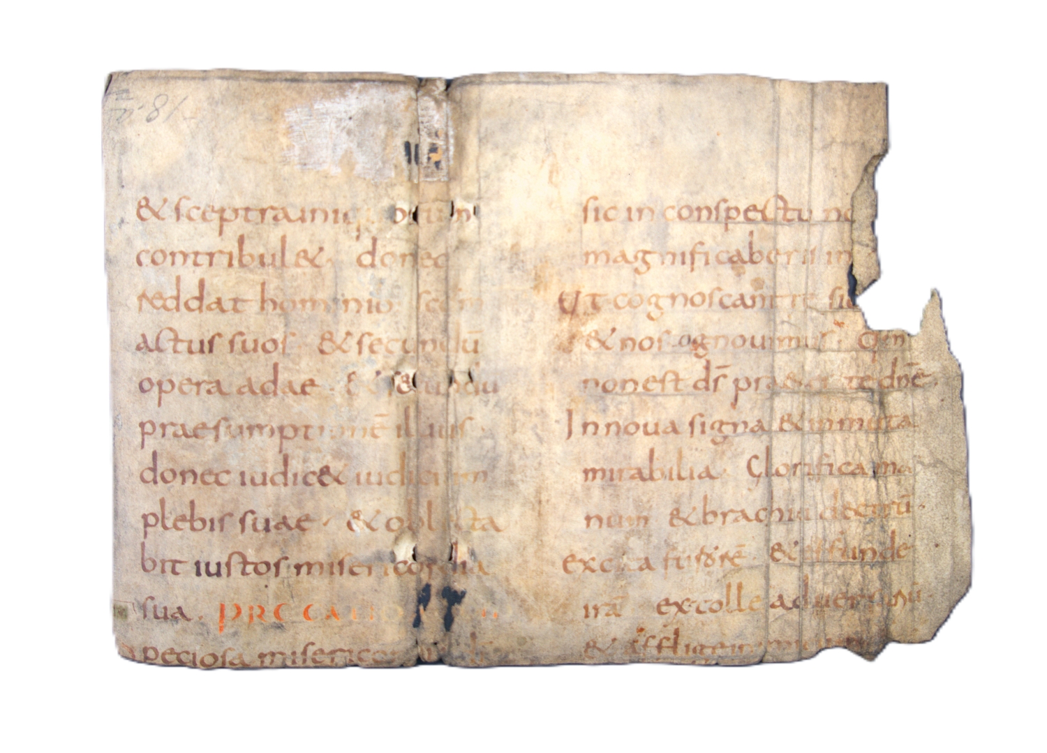 Sehr schönes Fragment einer frühmittelalterlichen Bibelhandschrift mit Textstellen aus dem Buch Jesus Sirach, dem kanonischen Buch Ecclesiasticus der Vulgata: "[Miserere plebi tuæ, super quam invocatum est nomen tuum: et Is]rahel quem coæqua[sti p]rimogenito tuo. [Misere]re civitati sanctificatiónis tuæ, Hierusalem, civitáti requiei tuæ. Reple Sion inenarrabilibus verbis tuis, et gloria tua populum tuum. Da testimónium quia ab initio creaturæ tuæ sunt, et suscita prædica[tiones quas locuti sunt in nomine tuo prophetæ priores]“ (Sir 35,23-26), also etwa: "Erbarme dich deines Volkes, über dem dein Name genannt ist, und Israels, das du zu deinem Erstgeborenen gemacht hast. Erbarme dich Jerusalems, der Stadt deines Heiligtums, der Stadt deiner Ruhe. Erfülle Zion mit deinen unaussprechlichen Worten und dein Volk mit deiner Herrlichkeit. Gib Zeugnis für deine Geschöpfe von Anbeginn an und verkünde die Botschaften, die die früheren Propheten in deinem Namen verkündet haben" (Sir 36:14-19). Das Buch Jesus Sirach fehlt in der Lutherbibel, für die es zu den apokryphen Texten gehört und nicht in den Kanon aufgenommen wurde.