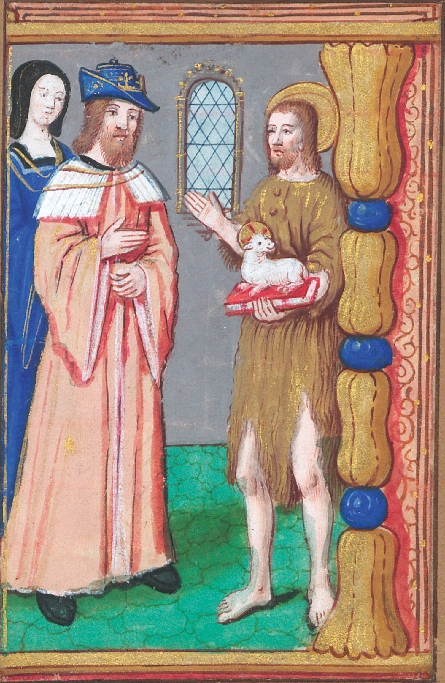 Die zweite Miniatur zeigt Johannes den Täufer mit Buch und Lammattribut, in - wiewohl goldgehöhtem - Lumpenkleid, wie er auf zwei Figuren, möglicherweise auf Herodes Antipas mit seiner jungen Tochter Salome. Johannes hebt seine Rechte belehrend, er kritisiert die Sitten des Tetrarchen von Galiläa, was zu seiner Gefangennahme und schließlich Enthauptung durch Salome führt.