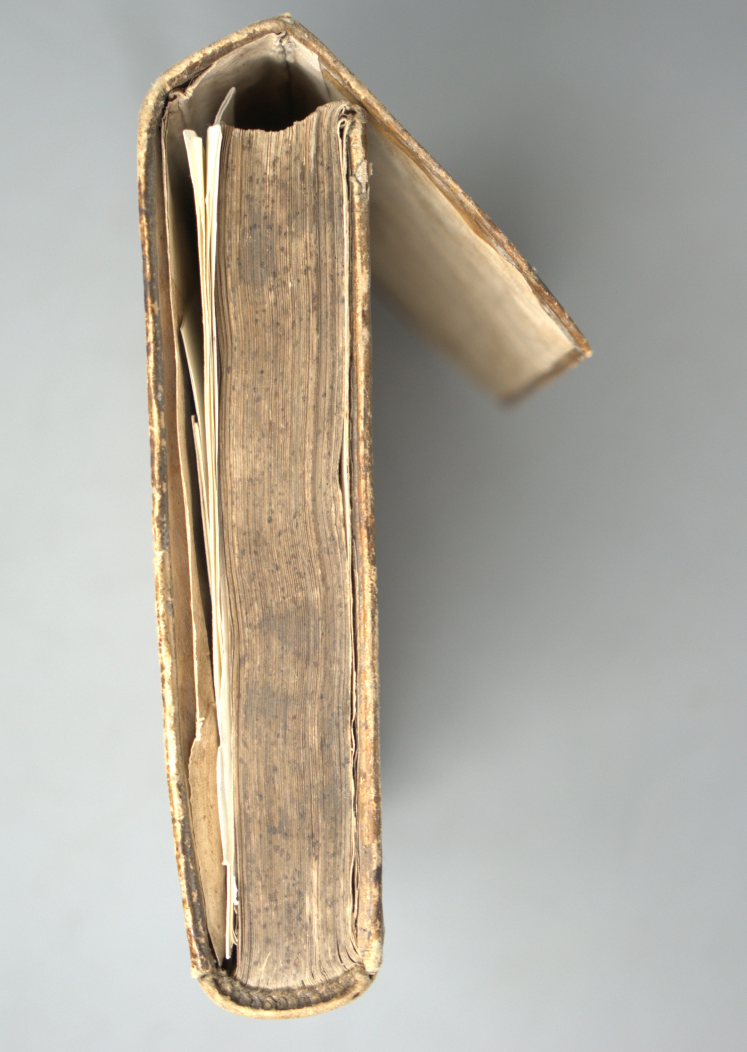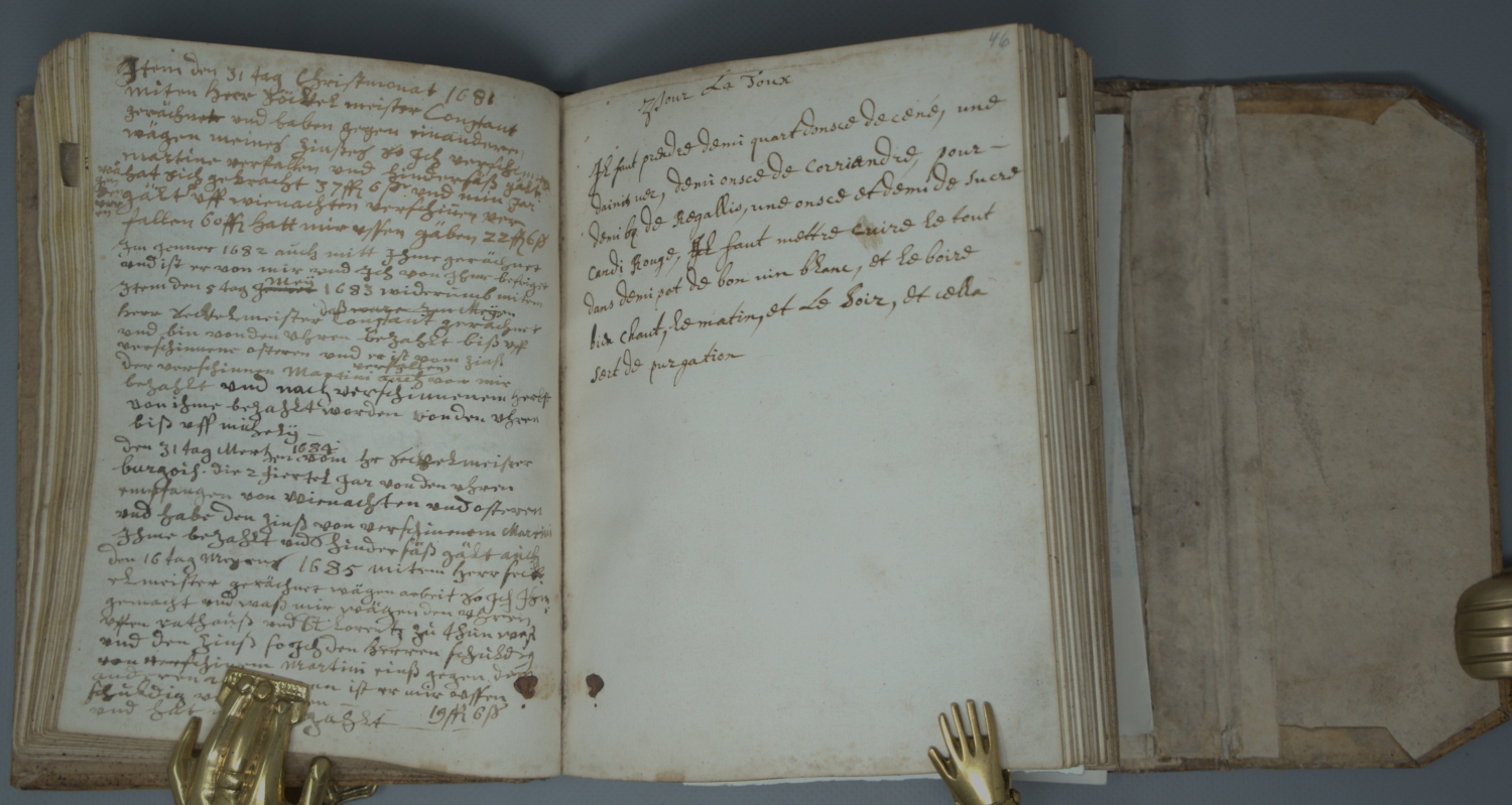 Auf leergebliebenen Blättern (1r-1v, 23v, 43r-46r, 73v. 106v-109v, 113v-114v) wurden im Zeitraum 1650-1694 persönliche und geschäftliche Aufzeichnungen von Mitgliedern der in der Ostschweiz (u.a. Lausanne) ansässigen Familien Krachbeltz, Criblet und Sechaux eingetragen. – Nur ganz vereinzelt etwas fleckig, wenige Randverstärkungen, Vorsätze stärker angestaubt und gedunkelt, wenige Seiten leicht angeschmutzt zum Schluss. Die unbeschriebenen Blätter meist blütenweiß. Der bemerkenswert schöne Klappenband mit reicher Blindprägung im Schweinsleder ist teils leicht abgegriffen und etwas angeschmutzt, zeigt neben Floralvignetten Blindstempel mit Eicheln und jeweils eine elegante Rolle mit den sieben Kardinaltugenden.