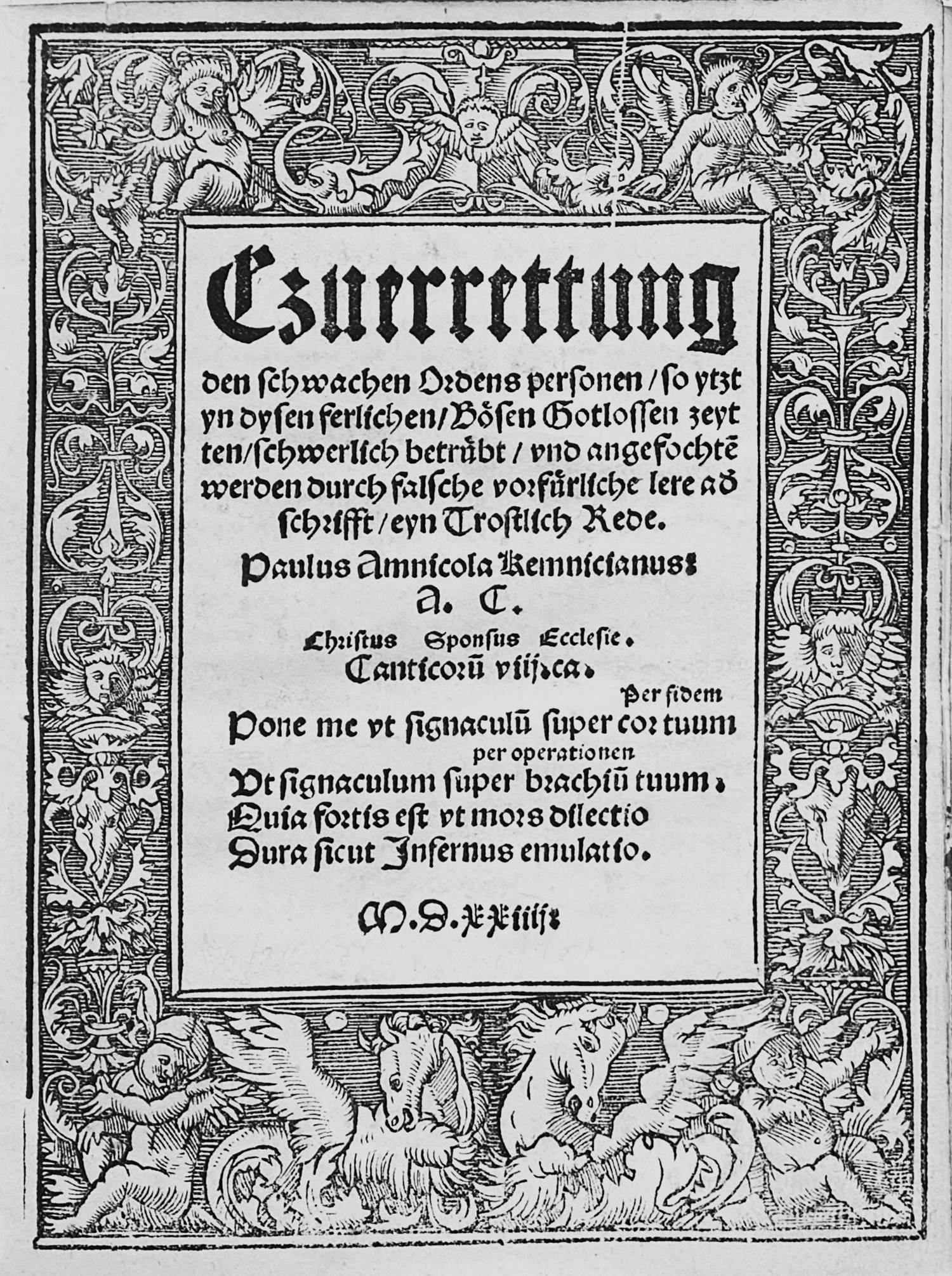 Bachmann, Paul. Czuerrettung den schwachen Ordens personen ... eyn Trostlich Rede. 51 Bl. Mit breiter Holzschnitt-Titelbordüre. 18,5 x 14 cm. Modernes Halbpergament mit goldgeprägtem Deckeltitel und Rotschnitt. (Dresden, Hieronymus Emser), 1524.