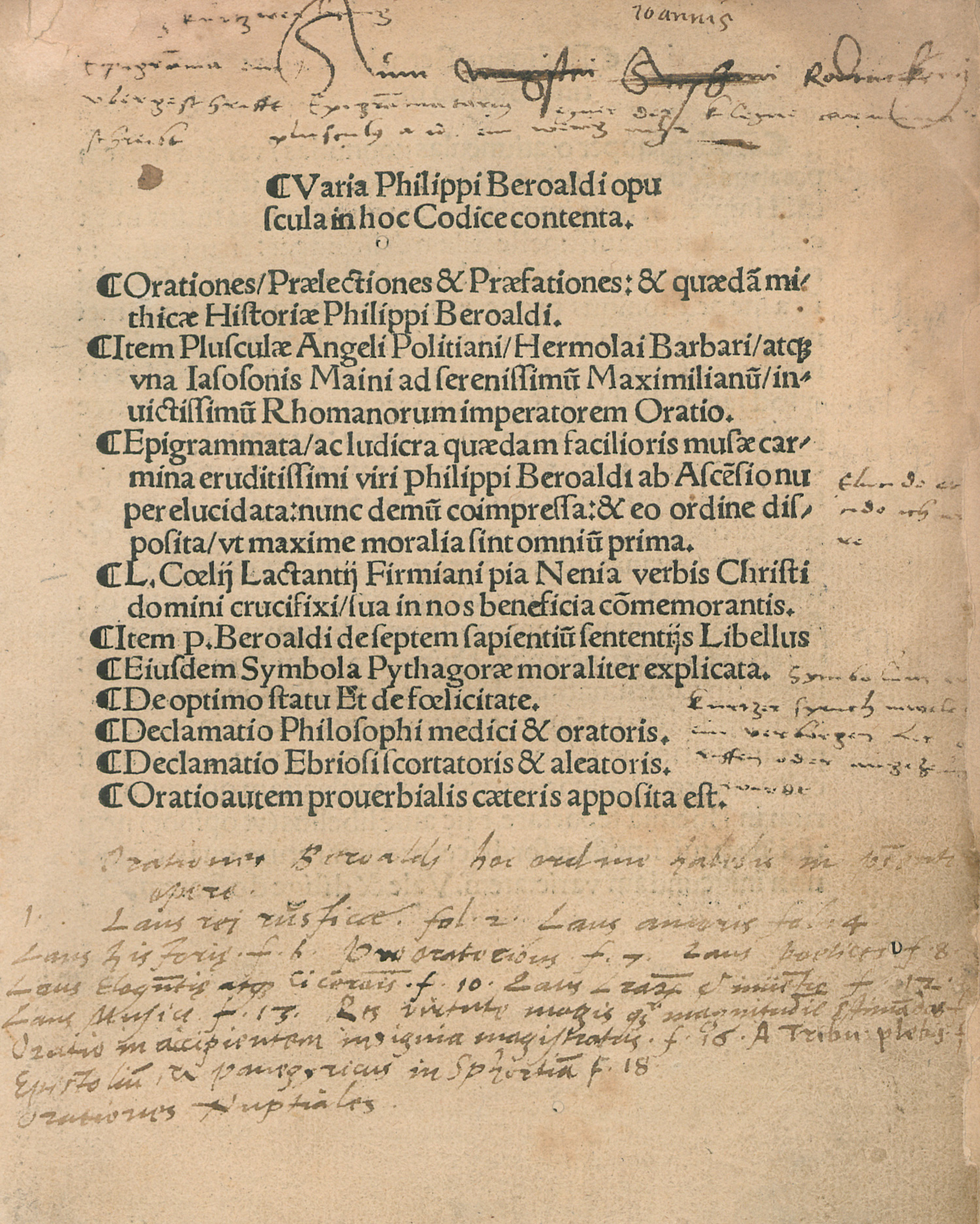 VD 16 B 2134. Panzer VI, 185, 75. – Erste Ausgabe der wohl ersten Schriftensammlung des Philologen und neulateinischen Dichters Philippo Beroald d. Ä. (1453-1505). – Es fehlt das Schlussblatt mit dem Kolophon (durch stark gebräuntes modernes Faksimile ergänzt). Titel mit Randläsuren und alten Annotationen, Blatt Dv mit Tintenwischern, stellenweise mit Feuchtigkeitsrändern und Wurmspuren. Etwas fleckig oder gebräunt, anfangs auch mit schmalem Feuchtigkeitsrand.