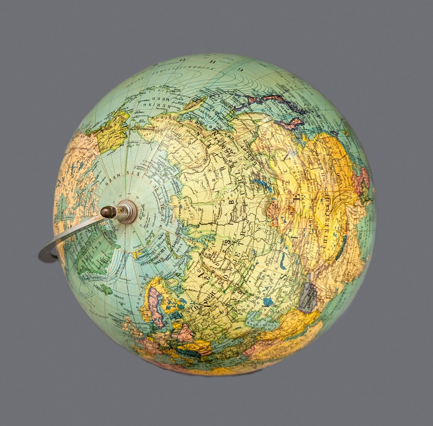 Schul- und Lehrglobus mit deutschsprachiger Beschriftung aus der Produktion des Verlages Columbus, Berlin. – Leichte Alterspatina. Vereinzelt kleine, restaurierte Einrisse bzw. Fehlstellen. Insgesamt guter Erhaltungszustand.