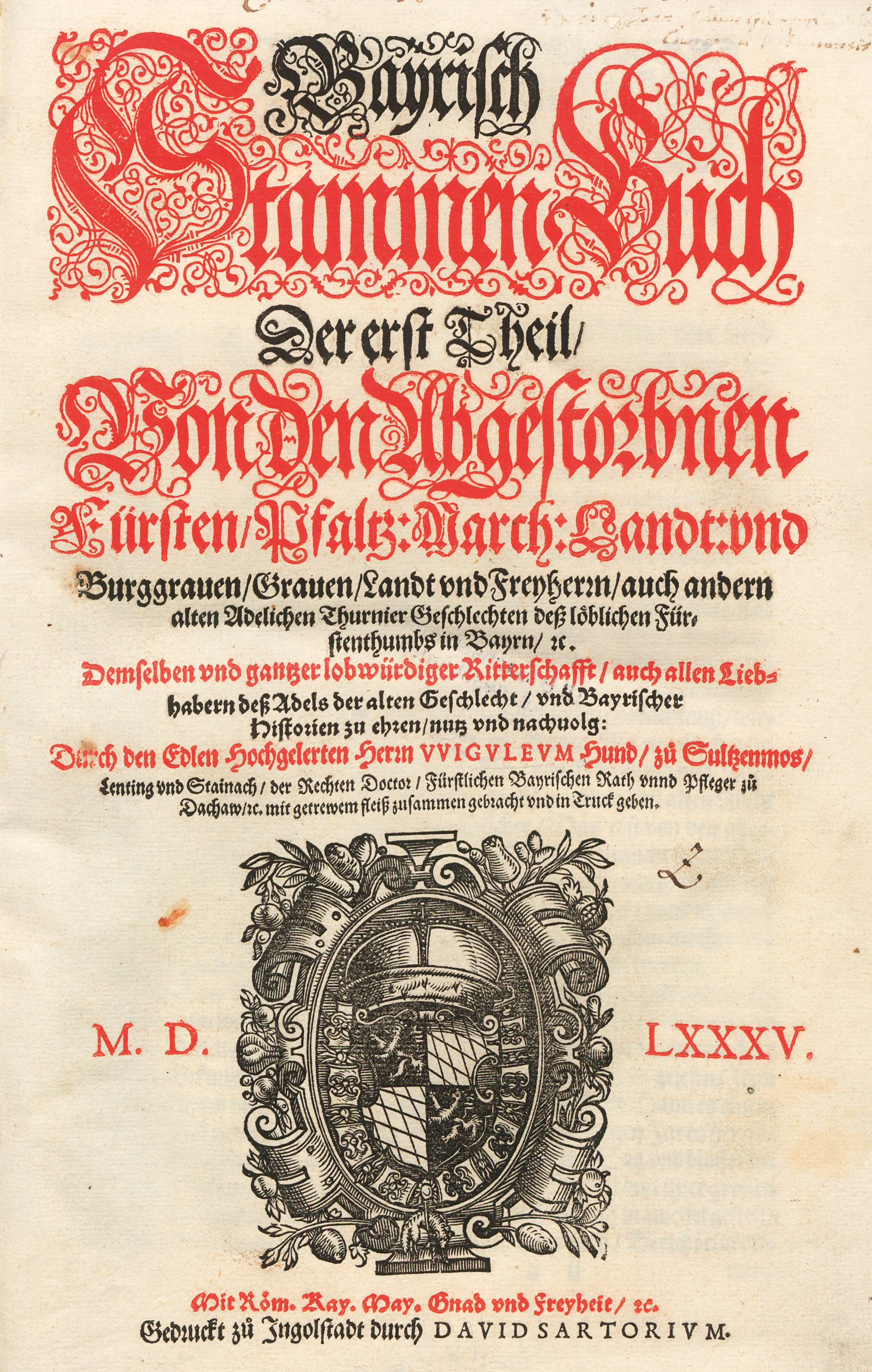 Hundt zu Sulzenmos, Wiguleus. Bayrisch StammenBuch der erst Theil, von den abgestorbnen Fürsten, Pfaltz: March: Landt: und Burggraven, Graven, Landt und Freyherrn, auch andern alten adelichen Thurnier Geschlechten deß löblichen Fürstenthumbs Bayrn, etc. Teil I (von 3). 18 Bl., 375 S., 1 Bl. Titel in Schwarz und Rot. Mit Wappenholzschnitt auf dem Titel. 30 x 20 cm. Halbpergament d. Z. (berieben, mit hs. RTitel und modernem Bibliotheksschild). Ingolstadt, David Sartorius, 1585.