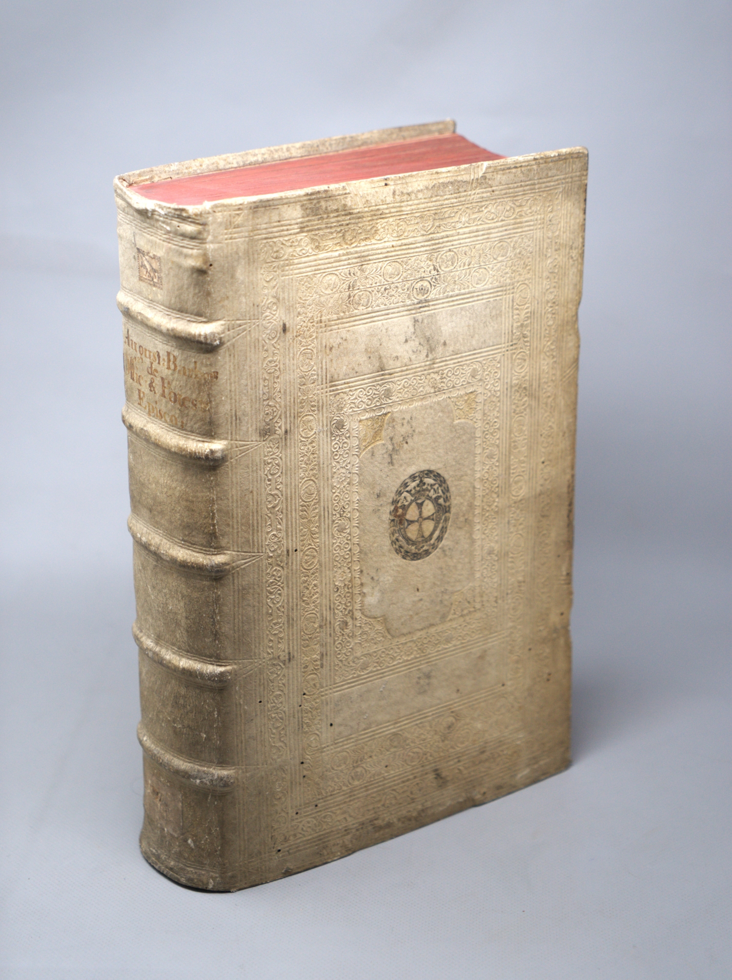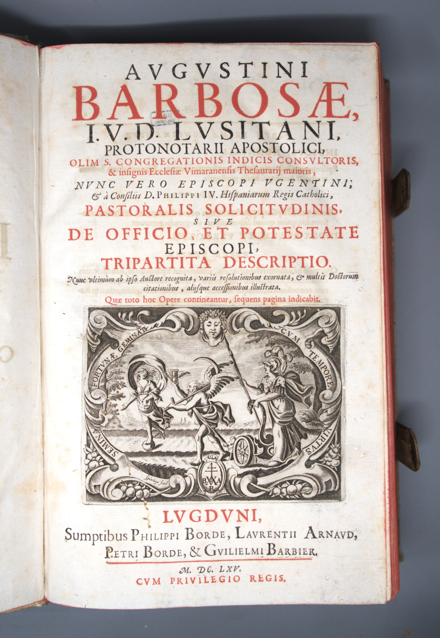 Barbosa, Agostinho. Pastoralis solicitudinis, sive de officio, et potestate episcopi, tripartita descriptio. Nunc ultimùm ab ipso auctore recognita, variis resolutionibus exornata, & multis Doctorum citationibus, aliisque accessionibus illustrata. 2 Teile in 1 Band. 16 Bl., 478 S., 55 Bl.; 611, 124 S., 2 Bl. Titel in Schwarz und Rot. Mit großer gestochener Druckermarke auf dem Titel (in Teil II als Holzschnitt wiederholt). 34,5 x 21,5 cm. Blindgeprägter Schweinslederband d. Z. (etwas fleckig und berieben; ohne Schließen) und Wappensupralibros mit den Initialen "AM" auf dem VDeckel. Lyon, Borde, Arnaud et al., 1665.