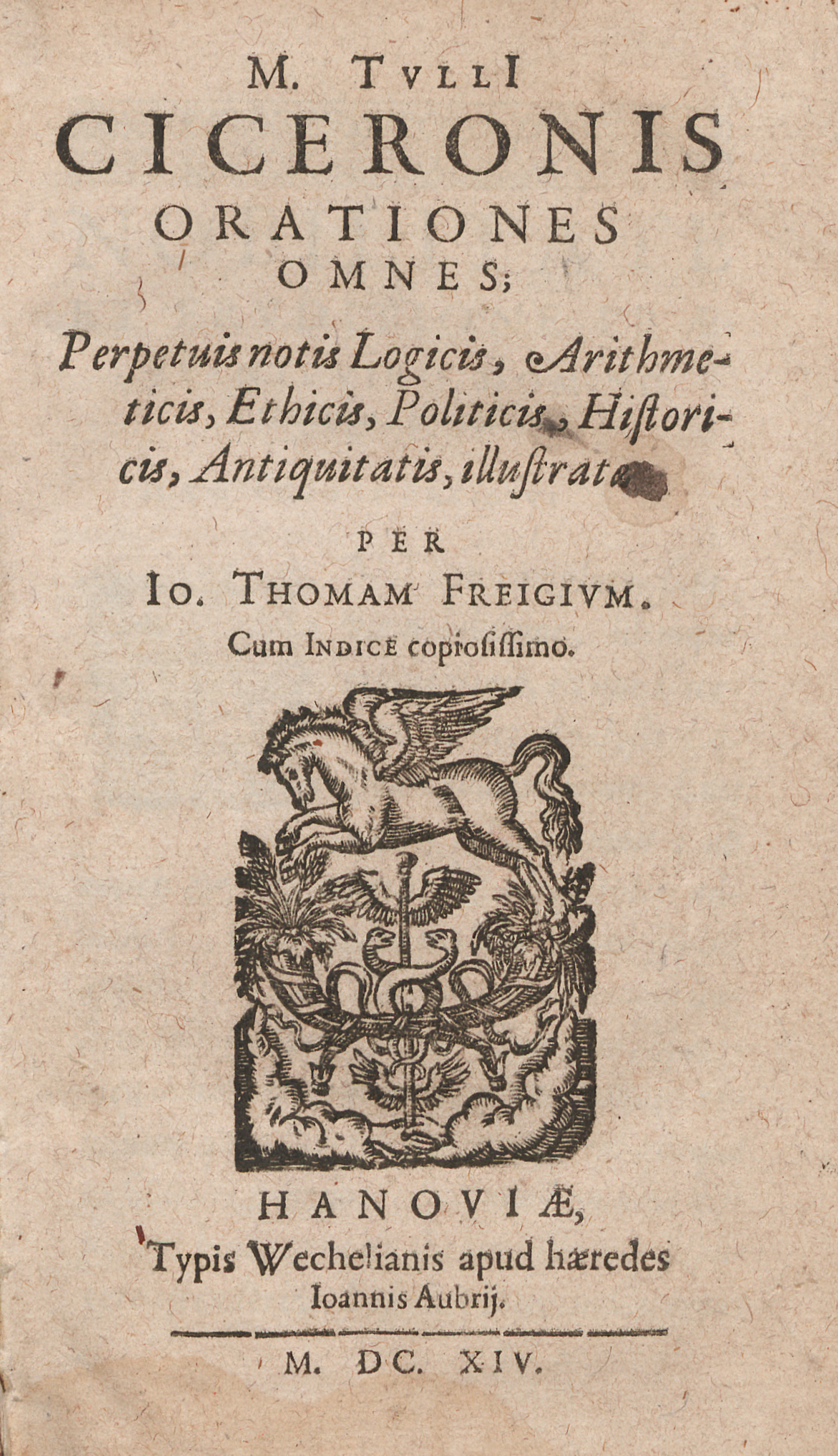 Cicero, Marcus Tullius. Orationes omnes. Perpetuis notis Logicis, Arithmeticis, Ethicis, Politicis, Historicis, Antiquitatis, illustratae per Io. Thomam Freigium. 3 Bände. Mit 3 wiederholten Holzschnitt-Druckermarken. 18 x 11 cm. Pergament d. Z. (etwas fleckig und berieben, Rücken nachgedunkelt). Hanau, Erben Andreas Wechel für Johann Aubry, 1614.