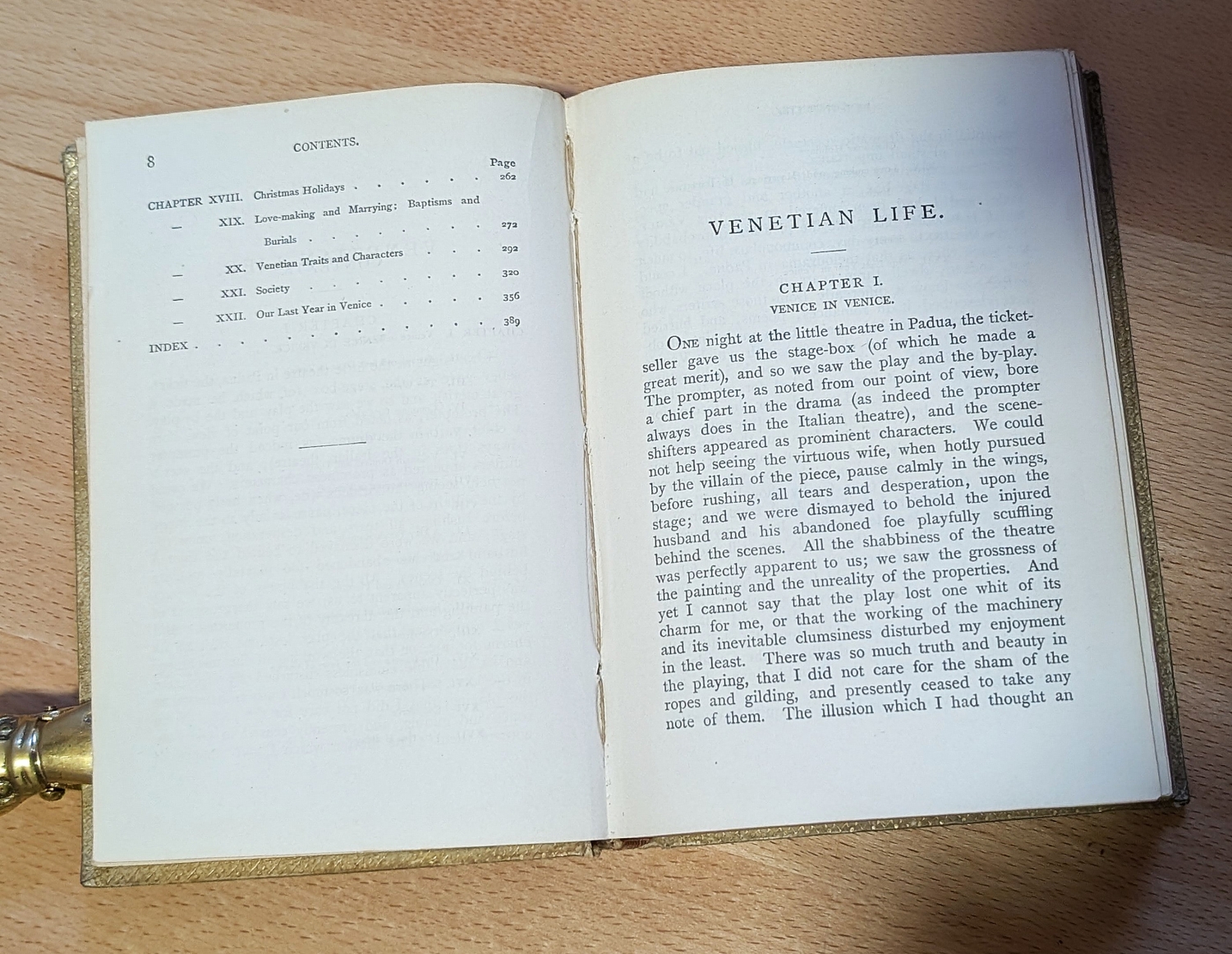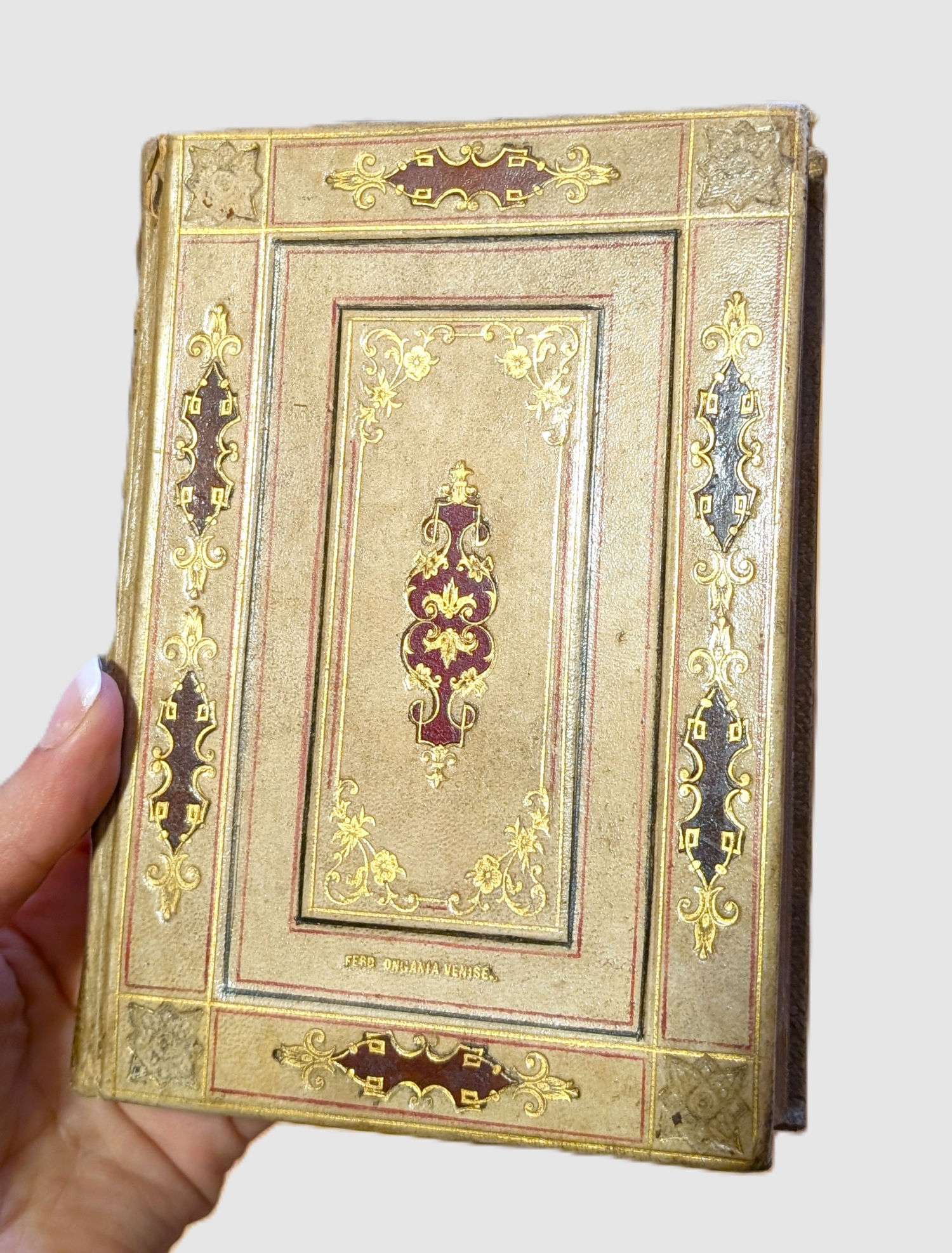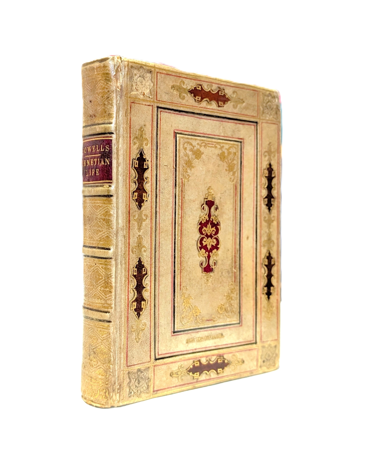 Prächtig gebundenes Werk von dem venezianischem Verleger Ferdinardo Ongania (1842-1911), der für die Ausgabe des Werkes "La Basilica San Marco in Venezia" bekannt ist. – Etwas berieben und bestoßen, oberes Kapital mit Einriss sowie vier Lederintarsien in Blütenform fehlen auf dem VDeckel. – Darin: William D. Howells. Venetian Life. 391 S. Mit Frontispiz. Leipzig, Bernhard Tauchnitz, 1883. - Mit verstärkten Innenstegen, fliegende Blätter etwas fleckig und papierbedingt leicht gebräunt.