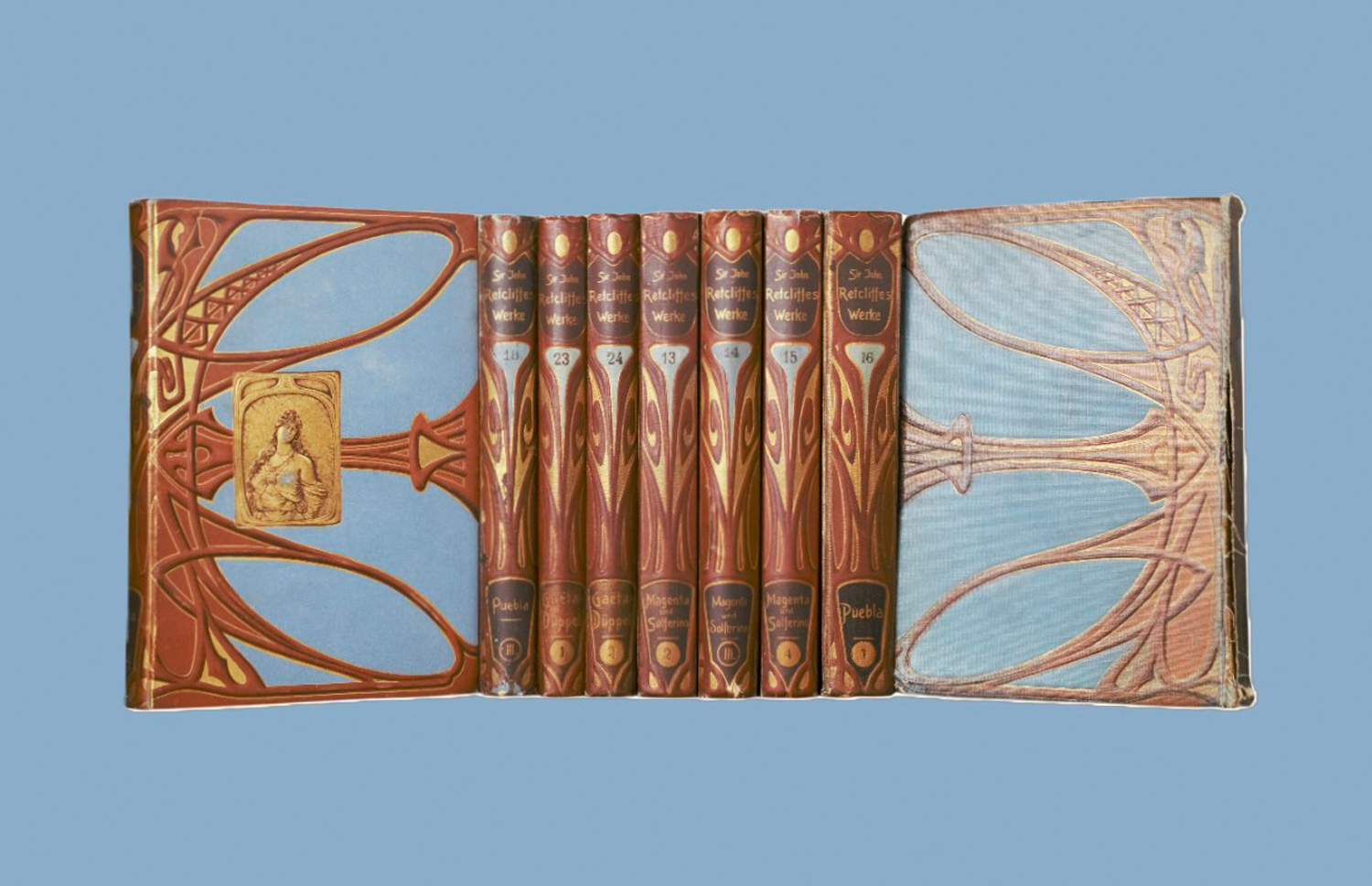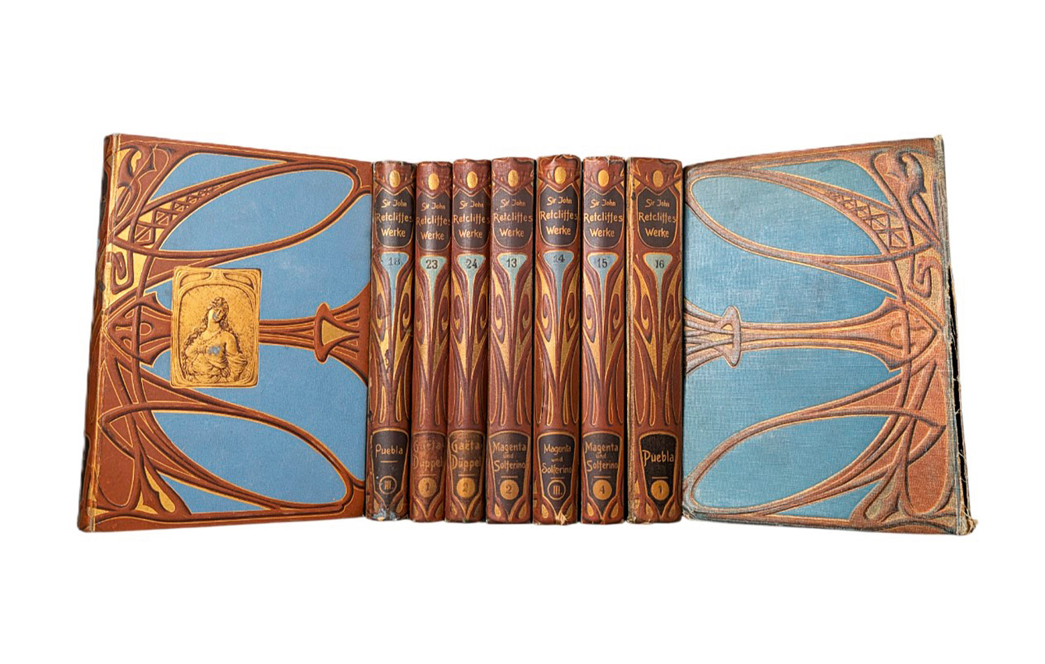 Retcliffe, John (d. i. H. O. F. Goedsche). Historisch-politische Romane. Durchgesehen und herausgegeben von Ernst Goetz. 36 Bände (statt 40; es fehlen die Bände XIX-XXII). 18,5 x 12,5 cm. OLeinen (berieben und bestoßen, einige Bände mit etwas stärkeren Gebrauchsspuren) mit reicher Gold- und Braunprägung mit Jugendstil-Ornamentik. Berlin, Karl Voegel bzw. Verlagsgesellschaft, (um 1920). - Papierbedingt gebräunt, teils mit Gebrauchsspuren.