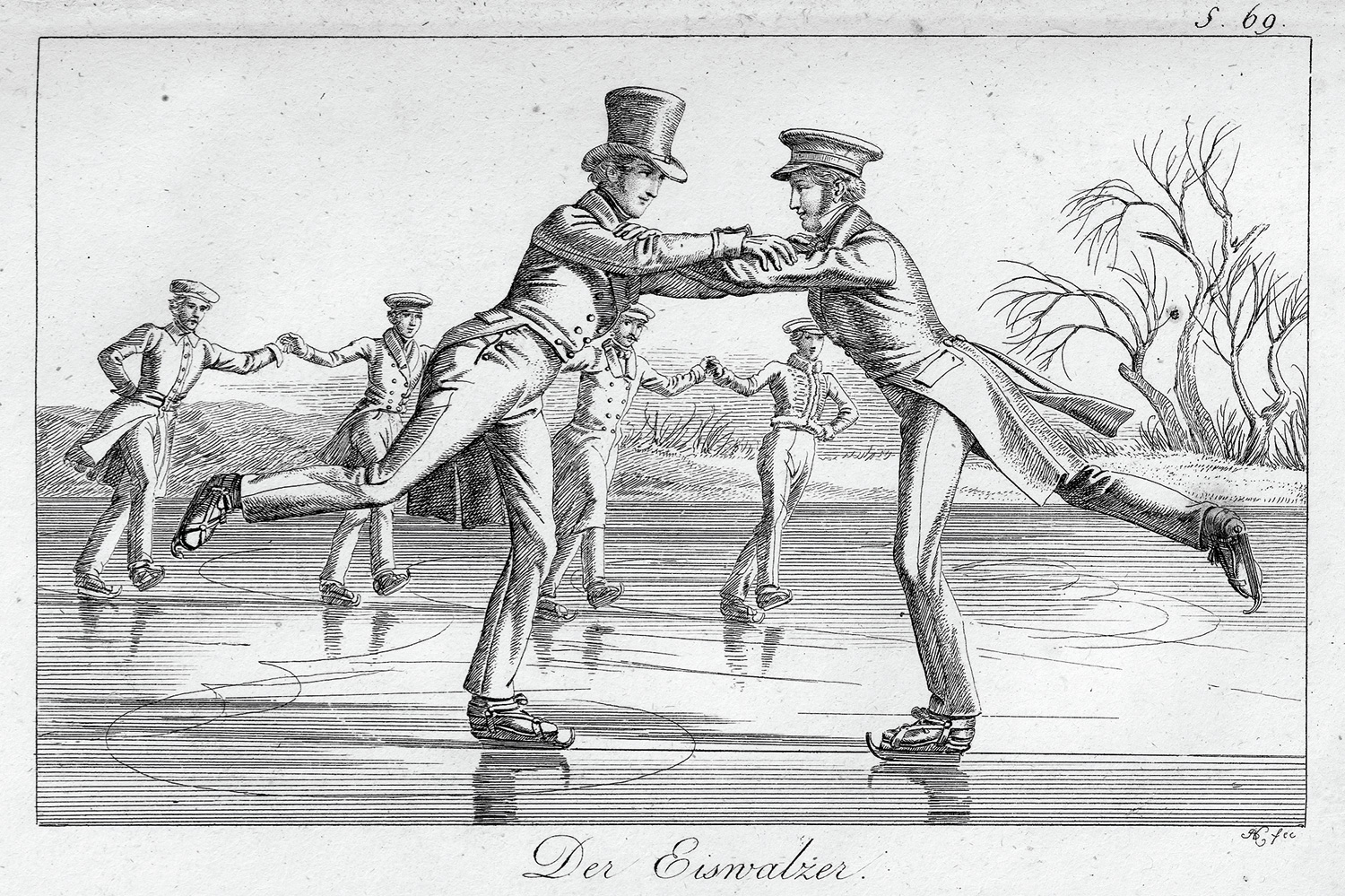 Goedeke IV/3, 223, 7. Köhring 43. Lanckoronska-Rümann 164. Hayn-Gotendorf VIII, 658. Lipperheide Thb 8. – Einziger Druck dieser ersten deutschen Veröffentlichung, die sich ganz dem Schlittschuhlaufen widmet. Enthält eine Anleitung mit technischen Erläuterungen der Kupfer, Formen der Schritt- und Schlittschuhe, Figuren und Techniken des Eislaufs, Vorsichtsmaßnahmen, ferner über Wettläufe, Schnelligkeitsrekorde, Eisfeste, Pariser Novitäten und Kuriositäten, Kleidung etc. Der umfangreiche Anhang mit zahlreichen poetischen Beiträgen und Briefen zum Thema, u. a. von Klopstock, dem passionierten Schlittschuhläufer Goethe, ferner von Herder, Platen und Ramler ("Wir tanzen, wir schweben auf tönendem Meer, auf Silberkrystallen dahin und daher: Der Stahl ist uns Fittig, der Himmel das Dach, die Lüfte sind eilig und schweben uns nach. So gleiten wir, Brüder! mit fröhlichem Sinn auf eherner Tiefe das Leben dahin." Herder). Das Frontispiz zeigt den Dutzendteich bei Nürnberg mit einer sich auf dem Eis tummelnden Menschenmenge, der illustrierte Einband mit allegorischen Darstellungen auf den Winter. – Die Tafeln gering fleckig. Sehr schönes und sauberes Exemplar auf festem, etwas bläulichem Papier. - Von großer Seltenheit.