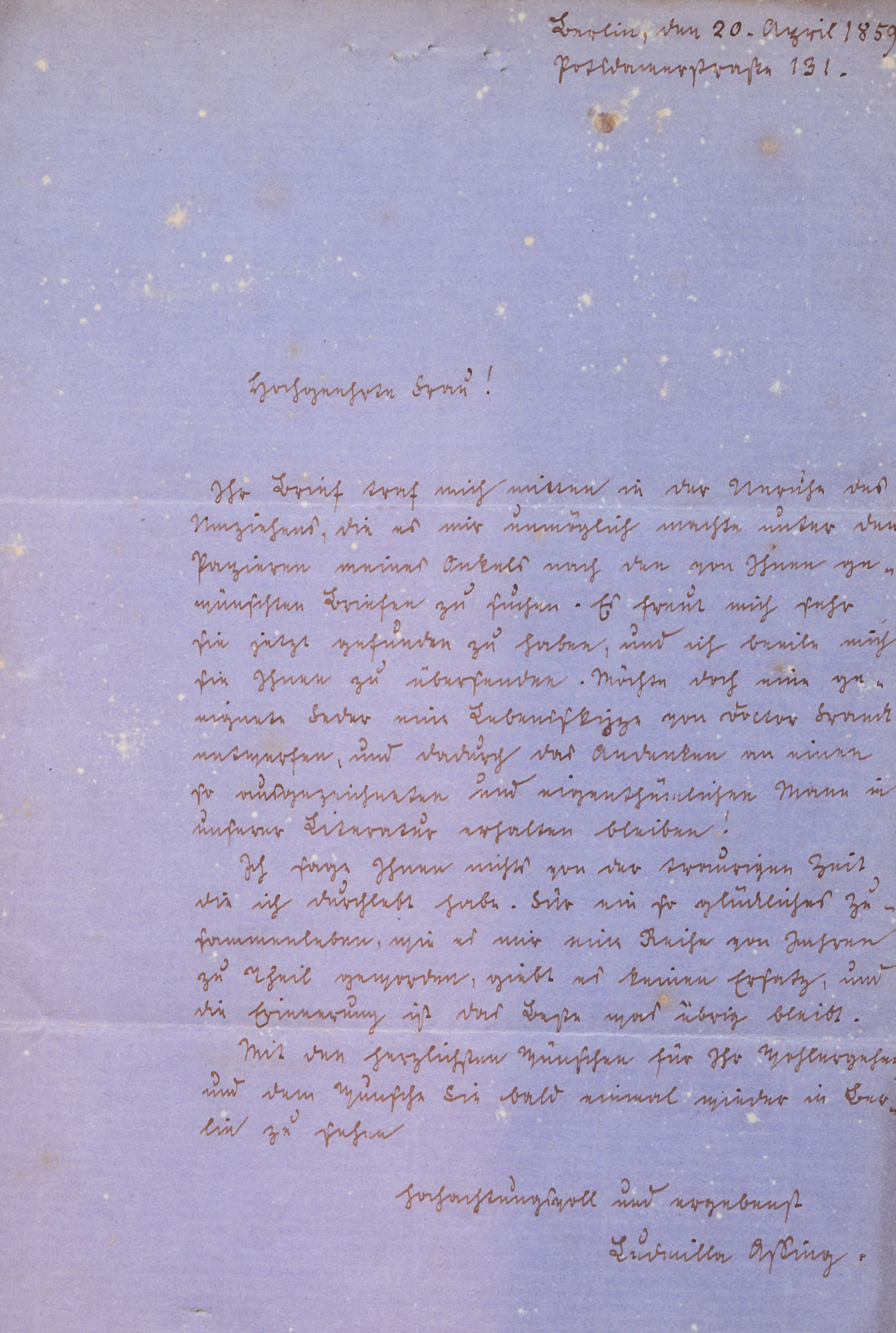 Assing, Ludmilla, Schriftstellerin, Biographin, Übersetzerin, Herausgeberin, Journalistin und Künstlerin, Nichte Karl August Varnhagens, Herausgeberin seines und anderer Personen Nachlässe (1821-1880). Eigh. Brief m. U. "Ludmilla Assing". 1 S. Blaues Papier mit weißen Einsprengseln. 8vo. Berlin 20.IV.1859.