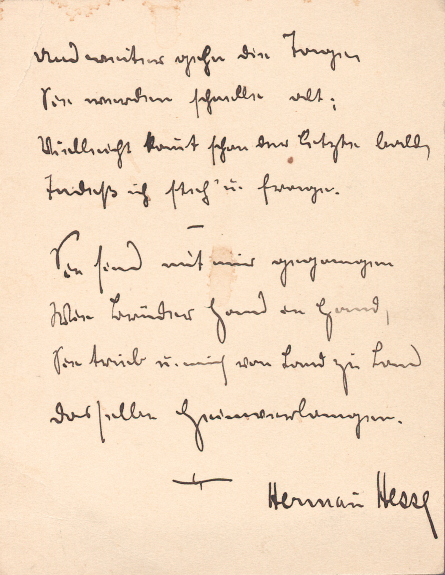 Hesse, Hermann, Dichter, Nobelpreisträger (1877-1962). Eigh. Gedichtmanuskript m. U. "Hermann Hesse". 1 S. Auf Karton (11,5 x 9 cm). O. O. (wohl circa 1901).