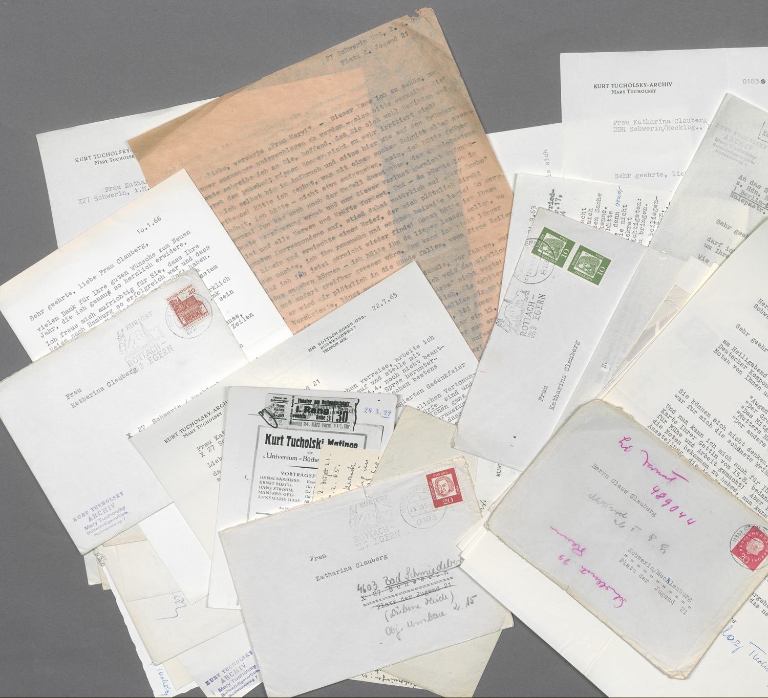 Reichhaltige Sammlung von masch. Briefen und Brief-Karten (davon 4 handschriftlich) an den Komponisten Claus Clauberg (1890-1963) und seine Witwe, die Sängerin Katharina Witt. Clauberg hatte eine Reihe von Texten Kurt Tucholskys bereits zu dessen Lebzeiten vertont und war trotz sozialistischer Gesinnung nach 1933 in Deutschland sowie nach 1945 mit seiner Ehefrau in der DDR verblieben. Die Briefe (und 5 Durchschriften von Gegenbriefen der Adressatin) handeln von den Tucholsky-Kompositionen Claubergs und von Veranstaltungen mit Texten Tucholskys in der DDR sowie ausführlich von den unermüdlichen Bemühungen Katharina Witt-Claubergs, das Andenken an ihren Mann zu beleben, seine Kompositionen im Rundfunk und auf Veranstaltungen unterzubringen sowie Tantiemen und andere Erlöse zu erwirken. Mary Tucholsky hilft ihr nach Möglichkeit und läßt ihr auch kleine DM-Spenden zukommen. Ihre Äußerungen über das Tucholsky-Archiv geben auch Aufschlüsse über die Entwicklung des Archivs im Verlauf der 22 Jahre.