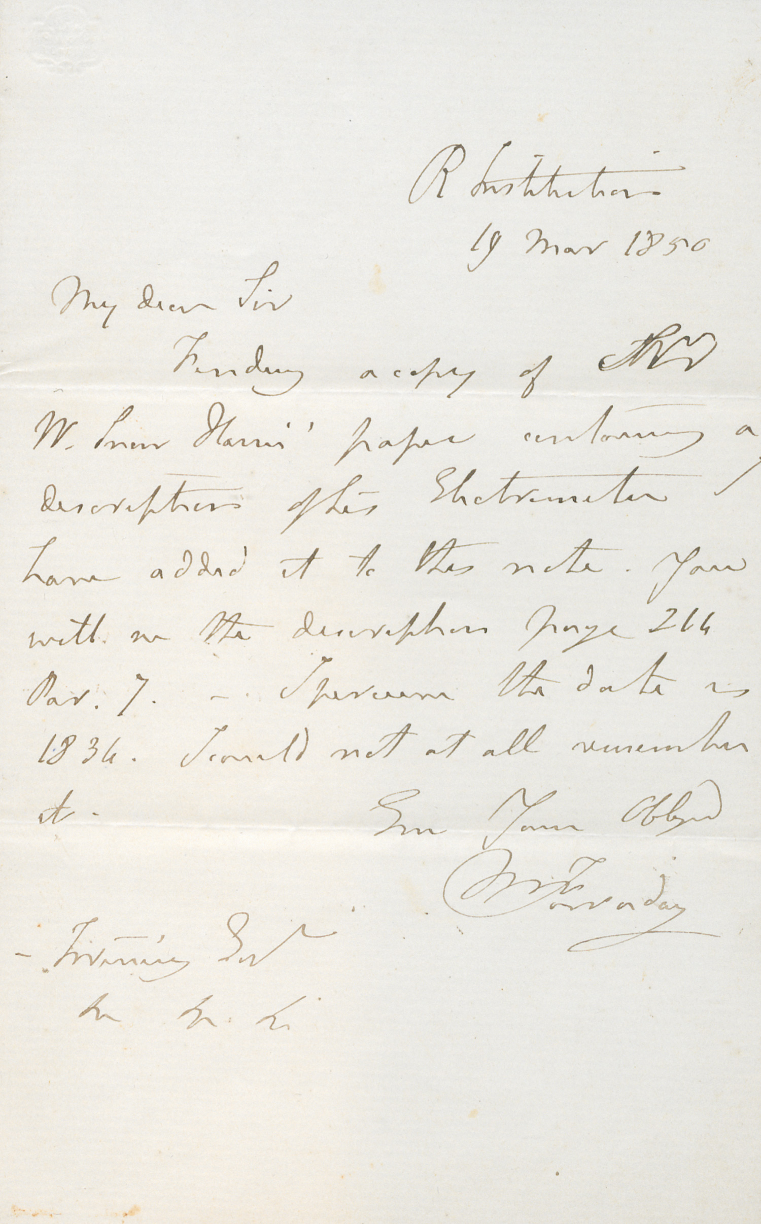 Faraday, Michael (1791-1867). Eigh. Brief m. U. "M Faraday". 1 S. Doppelblatt. 8vo. (London) Royal Institution, 19.III.1856.