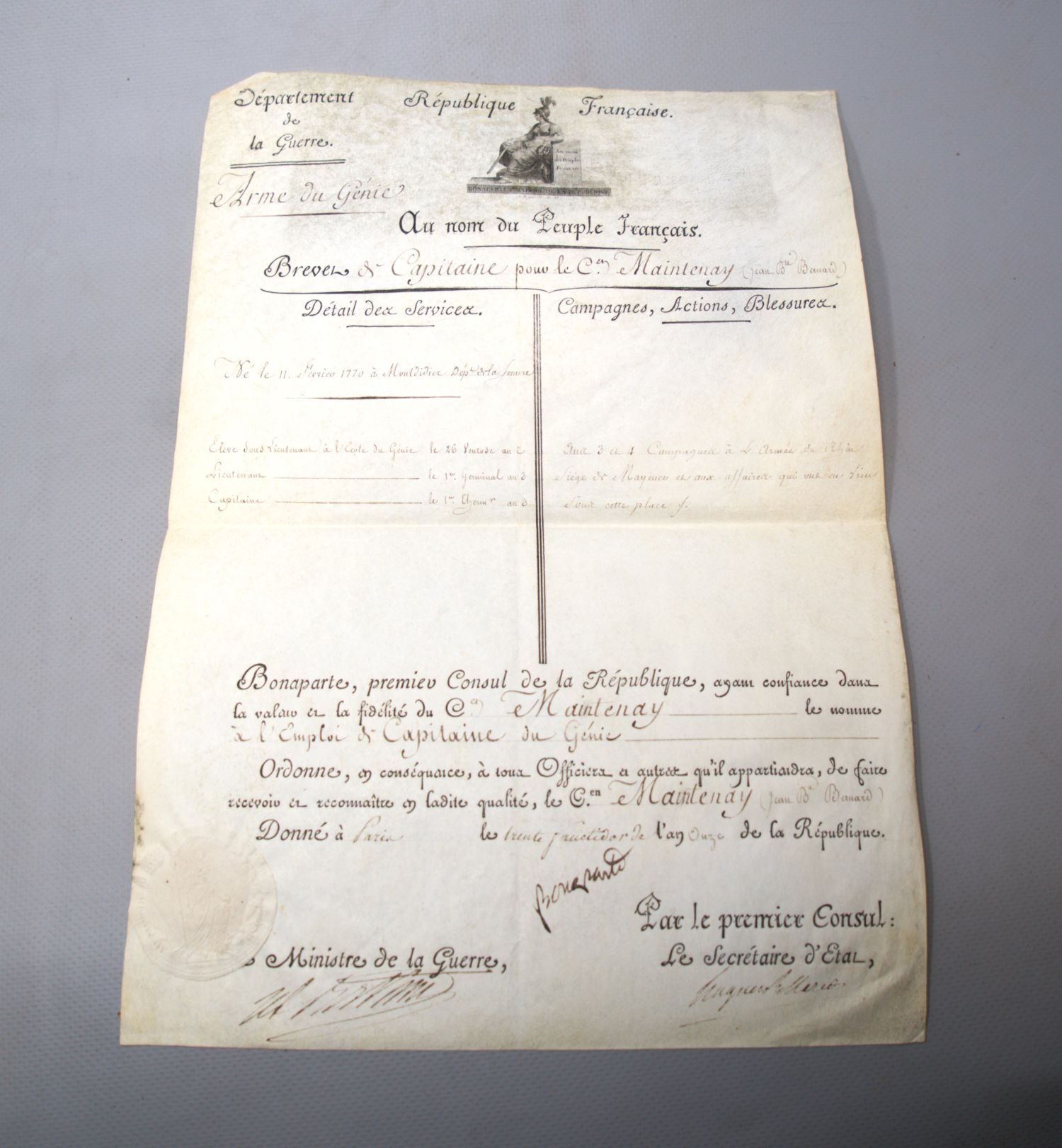 Napoleon als Erster Konsul der Republik unterzeichnet die Beförderung des Jean Baptiste Bernard Maintenay zum "Capitaine du Génie". Mit tabellarischer Angabe seiner Laufbahn und seiner Teilnahme an der Eroberung von Mainz. - Mitunterzeichnet vom Kriegsminister Alexandre Berthier, Prince de Neuchâtel, Fürst von Wagram (1753-1815). - Gut erhaltene Pergament-Urkunde aus der ersten Phase der Regierung Napoleons. - Der Namenszug "Bonaparte" wird von manchen Forschern der Hand seines Sekretärs Hugues Bernard Maret (des späteren Herzogs von Bassano) zugeschrieben, doch ist dies nicht erwiesen.