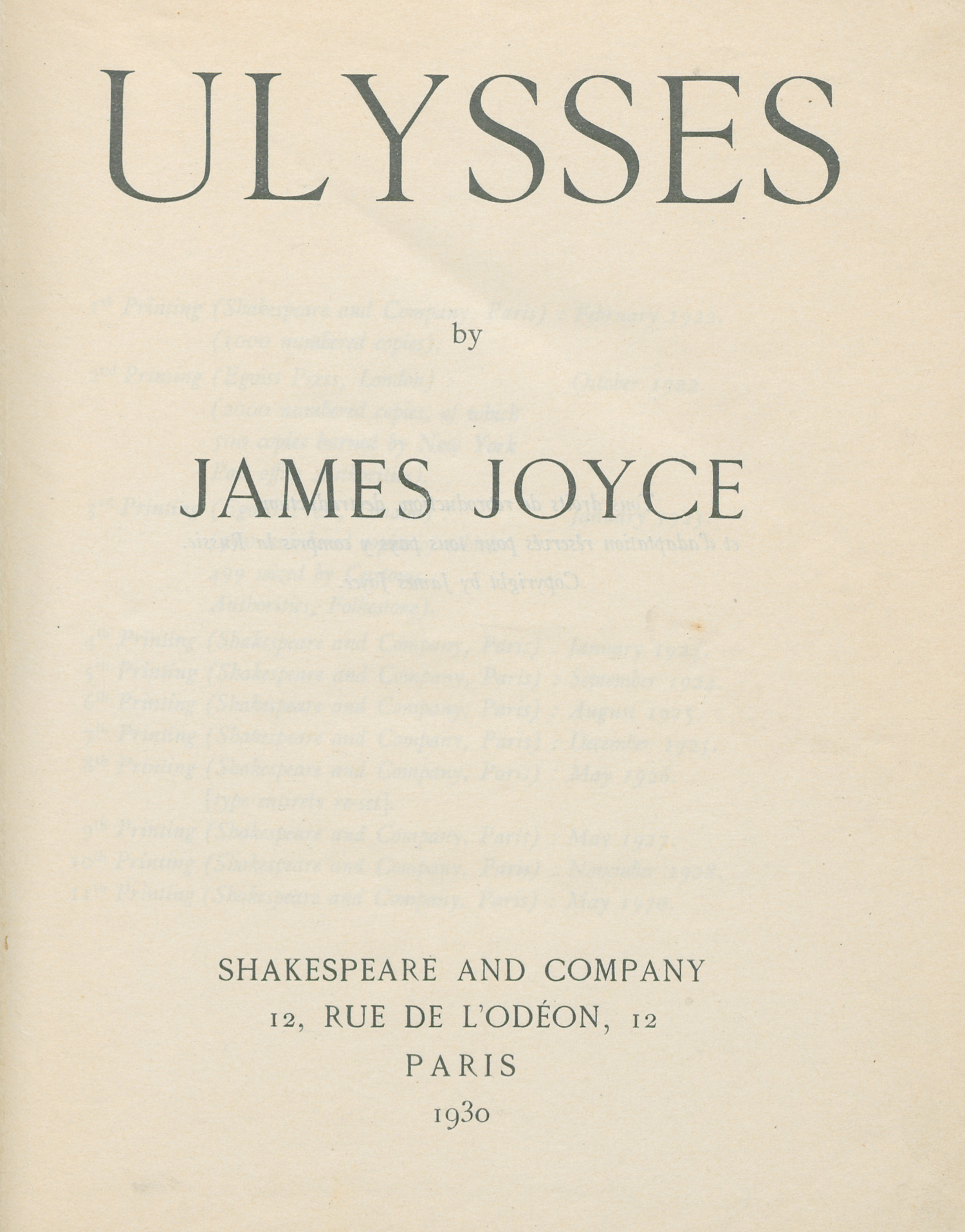Joyce, James. Ulysses. 11th Printing. 3 Bl., 735 S. 20,5 x 16 cm. Mod. blauer Linsonband mit Deckeltitel; (aufgezogener) OUmschlag eingebunden. Paris, Shakespeare and Company, 1930.