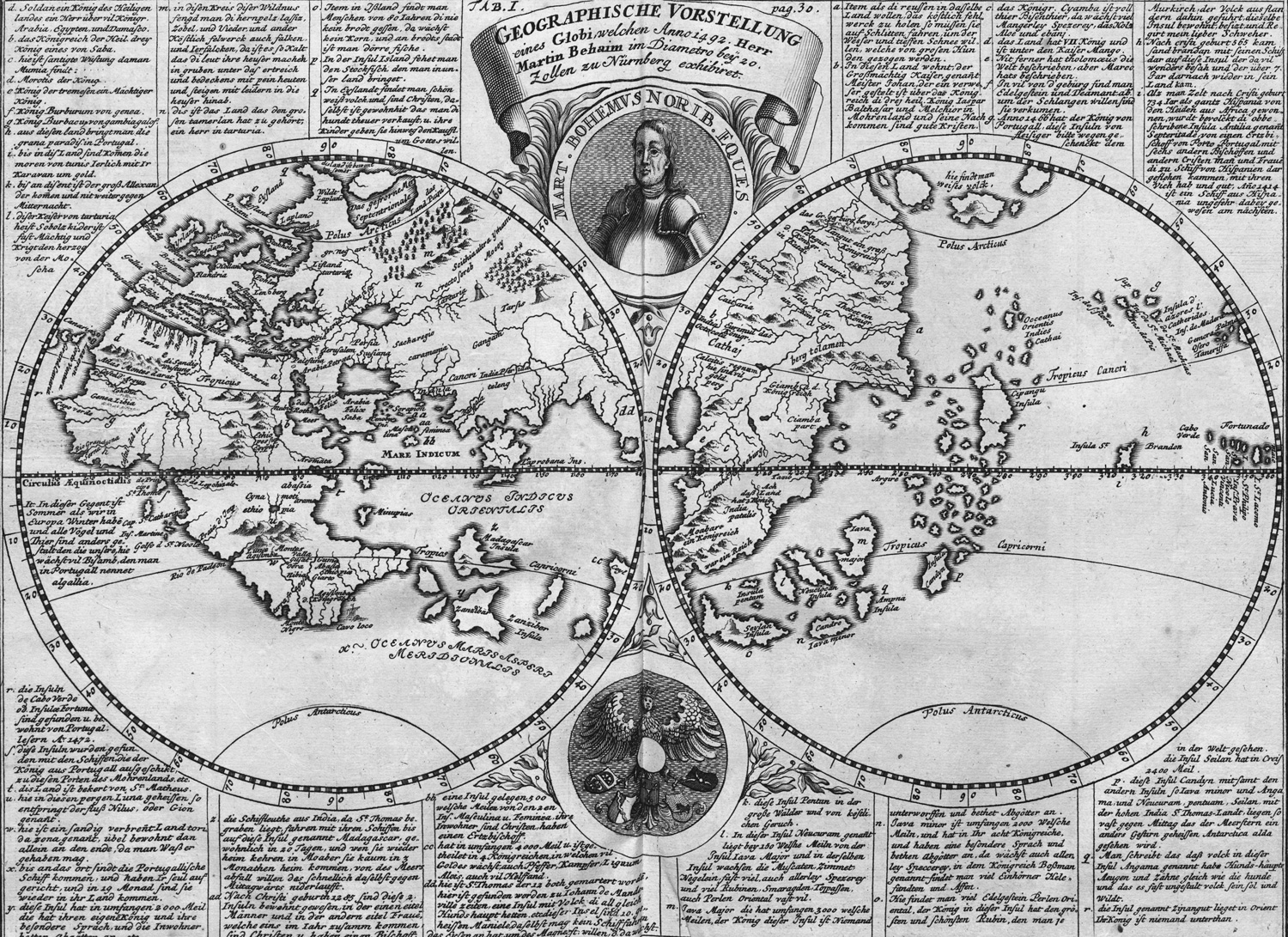 Graesse II, 427. Libri rari 87. Roller-G. I 332. Poggendorff I, 594. – Erste Ausgabe des bio-bibliographischen Werkes über Nürnberger Naturwissenschaftler, Techniker, Erfinder und Künstler, mit einem Katalog der in Nürnberg gedruckten naturwissenschaftlich-technischen Werke (ca 250 Titel). Über die Darstellung des Behaimschen Globus ist im Behaim-Ausstellungs-Kat. (3.34) zu lesen: "Als erste der zahlreichen Nachbildungen und Abzeichnungen des Globus wurde von dem Historiker Johann Gabriel Doppelmayr die Form einer Darstellung in zwei Scheiben, sogenannter 'Planisphären', gewählt, deren linke die alte Welt mit Europa, Afrika und einem Teil Asiens zeigt, deren rechte aber Ostasien mit der imaginären Darstellung Südostasiens und Japans präsentiert. Unten zwischen den beiden Planisphären befindet sich eine Abzeichnung des Nürnberger sogenannten 'Jungfrauenadlers' mit den Wappen der Ratsherren, die sich auf die Widmungsschrift beziehen." Die restlichen Tafeln zeigen Kunstwagen, J. Haydns Clavicimbel, Kunstwerke von A. Krafft, Veit Stoß, P. Fischer u. a. sowie Brunnen, Medaillen, Erfindungen (u. a. "Stephan Zickens Kunst-Aug") usw. – Braun- und fingerfleckig, die Tafeln etwas mehr betroffen. Titelblatt mit hinterlegtem Einriss.