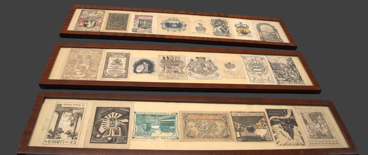 Exlibris. - Sammlung von 23 gestochenen und geschnittenen Exlibris. Unter Glas gerahmt in schlichter Holzleiste. Je 15 x 67 cm. Deuschland 19. bis frühes 20. Jahrhunderts.