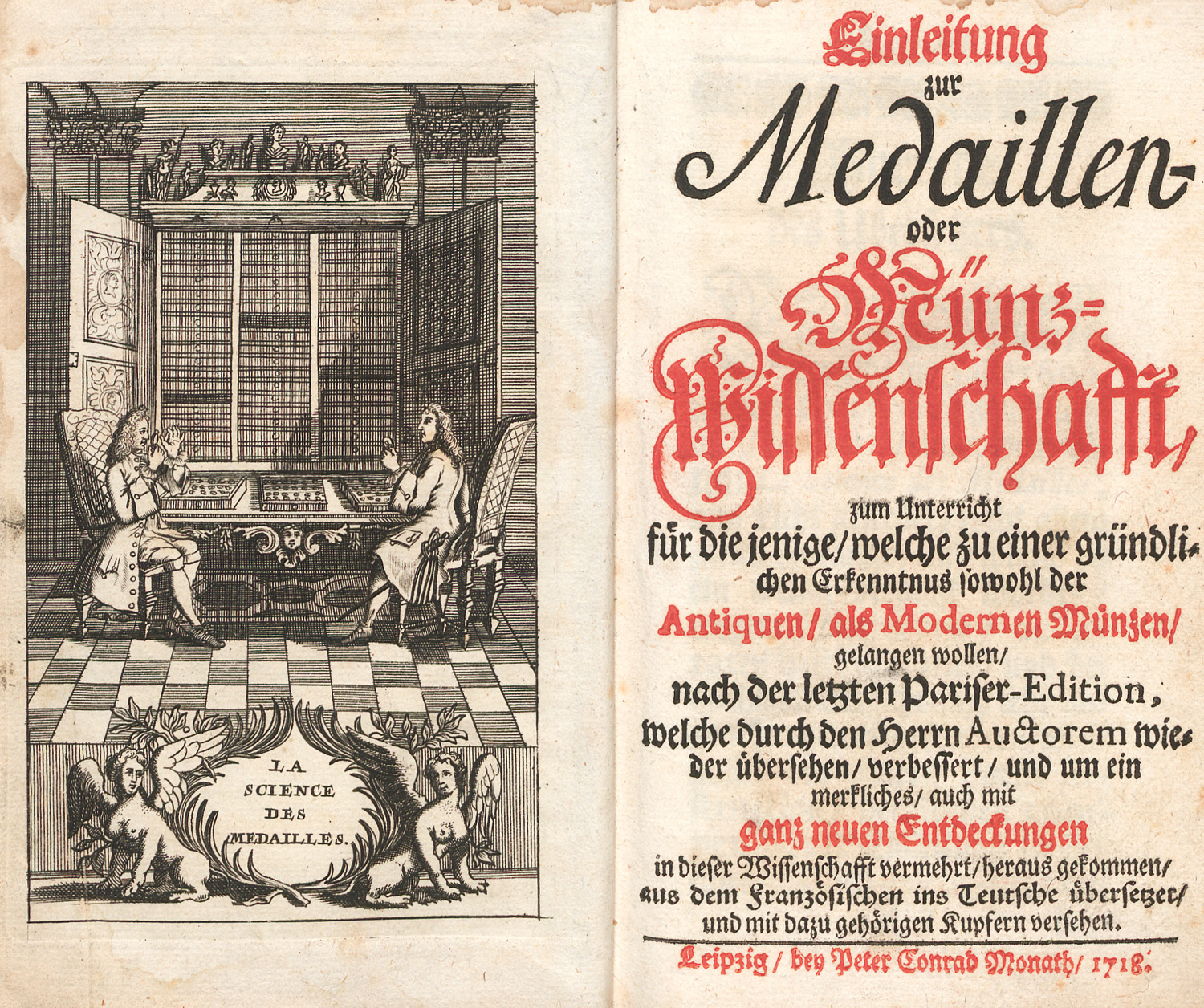 Jobert, Louis. Einleitung zur Medaillen- oder Münz-Wissenschafft, zum Unterricht ... nach der letzten Pariser-Edition, welche durch den Herrn Auctorem wieder übersehen, verbessert, und vermehrt heraus gekommen, aus dem Französischen ins Teutsche übersetzet. 15 Bl., 488 S., 12 Bl. Titel in Rot und Schwarz. Mit gestochenem Frontispiz, 2 Textkupfern und 11 Kupfertafeln. 16,5 x 10 cm. Pergament d. Z. (etwas fleckig und berieben) mit goldgeprägtem RSchild. Leipzig, Peter Conrad Monath, 1718.