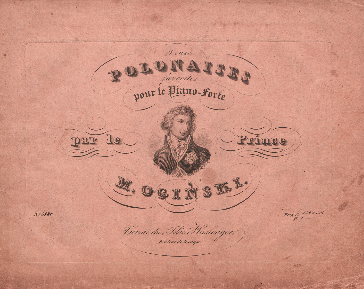 Der polnsich-litauische Fürst Michał Kleofas Oginski (geb. 1765 in Guzow, gest. 15. Oktober 1833 in Florenz) war Politiker und Diplomat und erlangte als Komponist besonders mit seinen Polonaisen große Bekanntheit. Die Illustration zeigt sein Porträt. Polonaise Nr. 11 für 3 Hände, Nr. 12 für 4 Hände. Plattennummern: T.H. 5180-5192. – Braunfleckig.