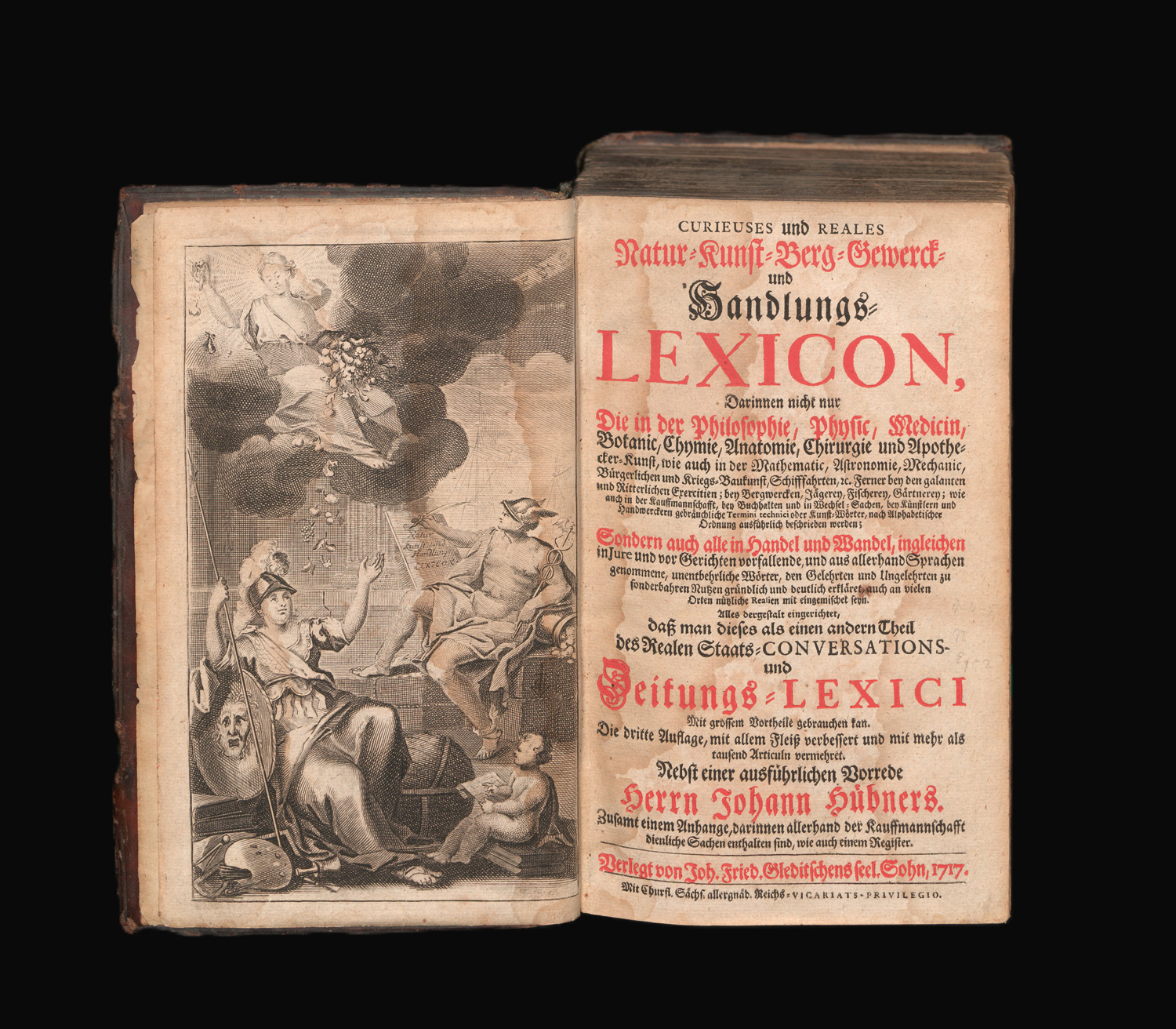 Hübner, Johann. Curieuses und reales Natur-Kunst-Berg-Gewerck- und Handlungs-Lexicon. Dritte Auflage. 6 Bl., 1808 Sp., 21 Bl. Titel in Schwarz und Rot. Mit gestochenem Frontispiz. 21,5 x 13 cm. Leder d. Z. (fleckig und berieben, Rücken teils lädiert, ohne Schließen). Leipzig, Johann Friedrich Gleditsch und Sohn, 1717.