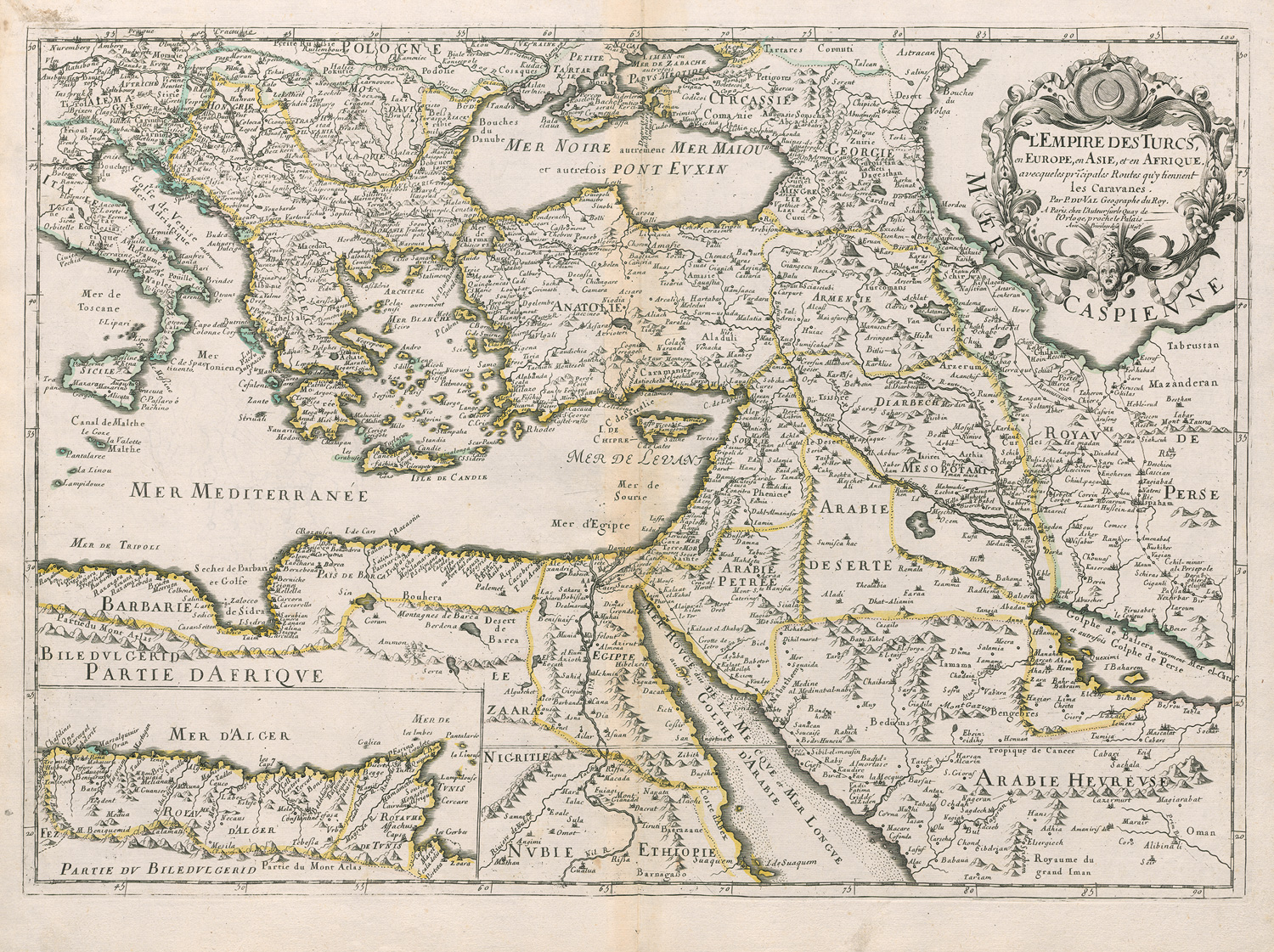 Duval, Pierre. L'Empire des Turcs en Europe, en Asie et en Afrique. Grenzkolorierte Kupferkarte. 38,5 x 53,5 cm (Plattenrand). Paris 1684.
