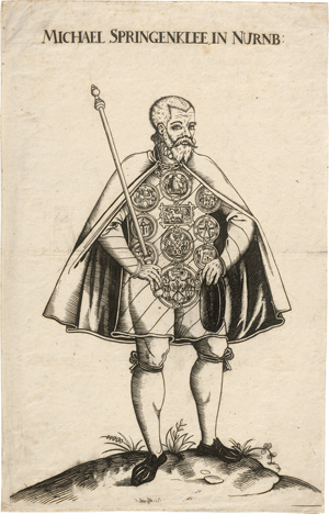 Blatt 27 der Folge. Ausgezeichneter, teils minimal ungleichmäßiger Druck mit den Spuren eines Rändchens um die Einfassung. Leicht fleckig, umlaufend, jedoch vor allem an den Seiten angerändert und dort die Darstellung und Einfassung mit der Feder ergänzt, verso ausgebesserte Stellen, dort ebenfalls mit Federretuschen im Text, weitere ausgebesserte Erhaltungsmängel, leichte Gebrauchsspuren, der Gesamteindruck noch gut.