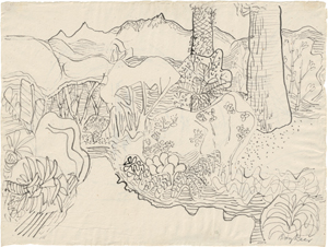 Aquarell, Pinsel in Schwarz und Bleistift auf dünnem Japanbütten. 1949.