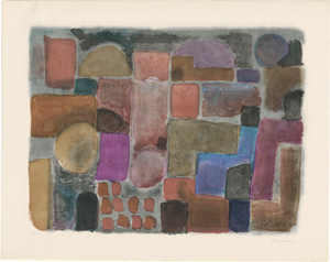 Bargheer, Eduard. Forio im Sommer. Blatt 7 der Suite 'Ischia'. Farblithographie von zwei Steinen. Mit hs. Nummerierung und Signatur von Eduard Bargheer. 32 x 43 cm (Darstellungsgröße). 43,4 x 61,3 cm (Blattgröße). Unter Passepartout. 1965.