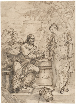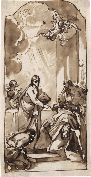 um 1600. Studienblatt mit Kindern unter einem Vorhang