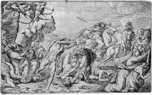 Apollo und Diana schießen mit Pfeilen auf die Kinder der Niobe. Radierung. 17,5 x 28,3 cm. Le Blanc 63.