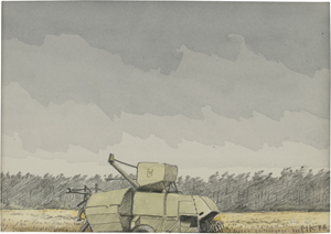 In dieser charmanten, frühen Zeichnung erfasst Koeppel in typischer Manier unter weitem Himmel einen so alltäglichen Gegenstand wie einen Mähdrescher. Äußerst akribisch und detailliert dargestellt, schwingt hier womöglich eine gewisse ironische Auffassung mit, die sich in der Ähnlichkeit des Mähdreschers mit einem Panzer zeigt.