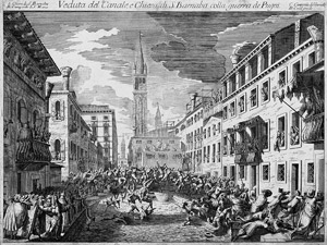 "Veduta del Canale, e Chiesa di S. Barnaba colla guerra de Pugni"