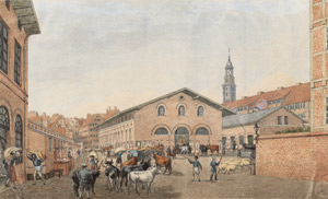 Aquarell. 20,9 x 34 cm. Auf dem Untersatzpapier unter der Darstellung rechts in brauner Feder bezeichnet und datiert "Nach der Natur gezeichnet von Peter Suhr 1842." sowie darunter betitelt "Das neue Schlachthaus in Hamburg, eingeweiht am 8ten Dezember 1841."