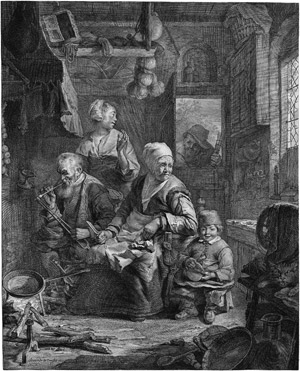 Die Pfannenkuchenbäckerin. Kupferstich mit Radierung. 43,3 x 35 cm. Hollstein 52 VI. Wz. Trauben mit Schrift.