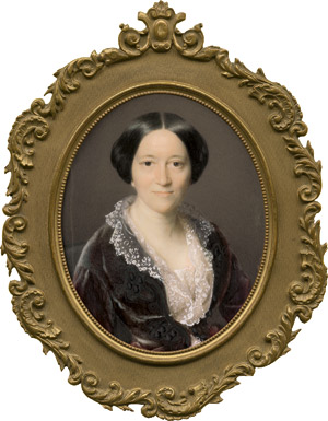 um 1840. Bildnis einer Frau in schwarzem Keid mit weißem Spitzenbesatz und Schal