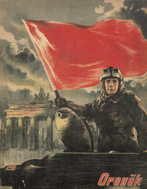 Ogonjok (rossice: Flämmchen). 20 Hefte der Zeitschrift. Mit zahlreichen fotograf. Abb., Illustrationen und Karikaturen. 32,5 x 25,5 cm. Meist farb. illustr. OBroschur. Moskau 1945.