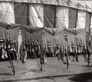 Film set photos taken during the filming of "Tiefland". Circa 1944. 53 vintage gelatin silver prints. Various sizes, between 18 x 10 cm, 10 x 14 cm and 9 x 6 cm. Mounted to album pages, bound in contemporary canvas album with cord binding (slight traces of use).