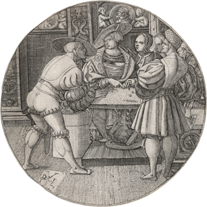 Drei Männer beim Würfelspiel. Kupferstich im Rund. D. 9,2 cm. B. 1, Nagler, Die Monogrammisten, IV, 3395, 4, Hollstein 7.