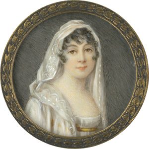 Anfang 20. Jh. Bildnis einer jungen Frau in weißem Empirekleid mit goldfarbigem Gürtel und langem besticktem weißem Schleier