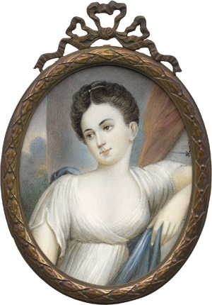 spätes 19. / frühes 20. Jahrhundert. Bildnis einer jungen Frau in weißem Gazekleid mit blauem Schal, vor rotem Vorhang, Säule und Landschaftshintergrund