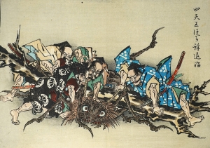 2 Holzschnitte von Kriegern im Kampf mit Kreaturen. Tokio spätes 19. Jahrhundert