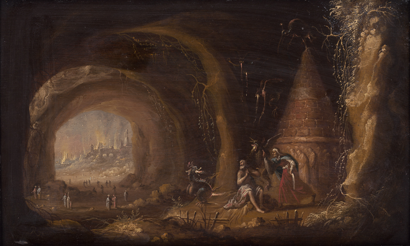 (1605 Amsterdam - nach 1657)Inneres einer Felsengrotte mit der Versuchung des hl. Antonius und einer vor der Grotte brennenden Stadt