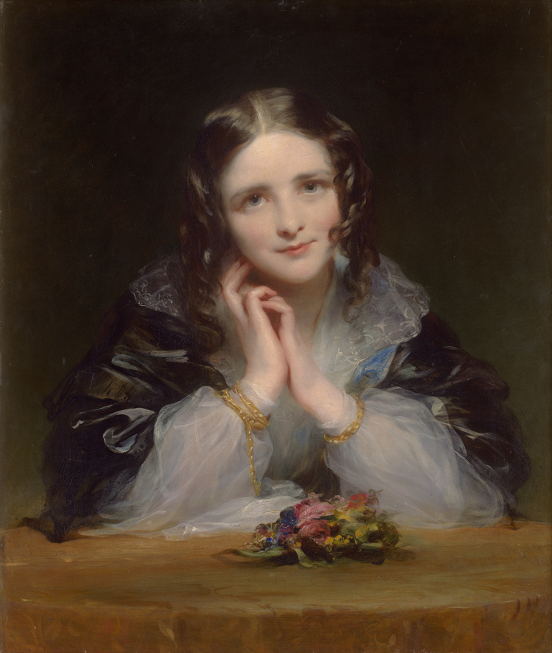 um 1850. Bildnis einer jungen Frau in hellblauem Tüllkleid mit schwarzem Schultertuch