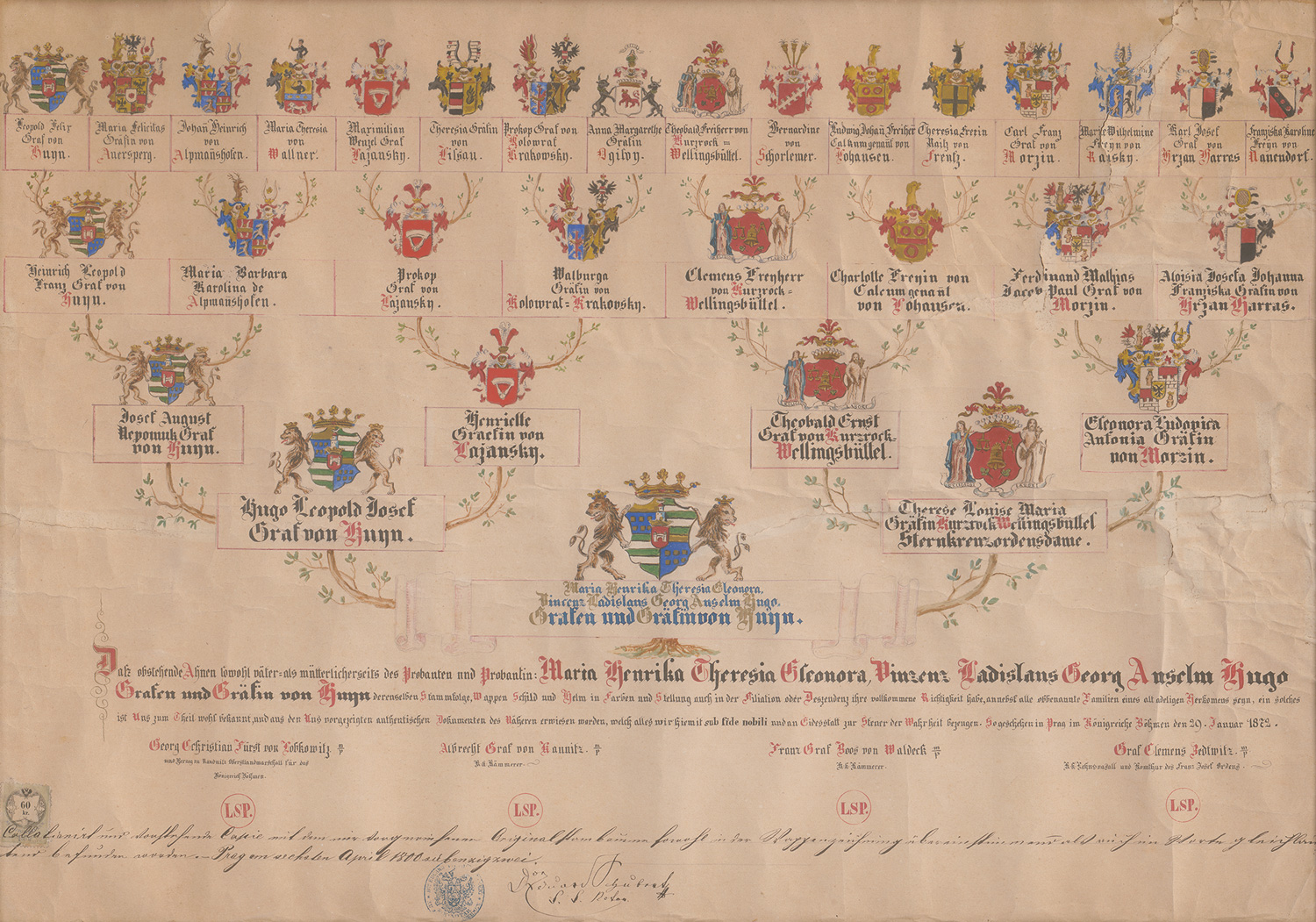 "Daß obstehende Ahnen sowohl väter- als mütterlicherseits des Probanten und Probantin: Maria Henrika Theresia Eleonora, Vinzenz Ladislaus Georg Anselm Hugo Grafen und Gräfin von Huyn derselbenStammfolge, Wappen Schild und Helm in Farben und Stellung auch in der Filiation oder Deszendenz ihre vollkommene Richtigkeit habe, annebst alle obbenannten Familien eines alt adelingen Herkomens seyn, ein solches ist Uns zum Theil wohl bekannt, und aus den Uns vorgezeigten authentischen Dokumenten des Näheren erwiesen worden, welch alles wir hiemit sub fide nobili und an Eidesstatt zur Steuer der Wahrheit bezeugen. So geschehen in Prag im Königreiche Böhmen den 29. Januar 1872. Graf Clemens Zedtwitz. K.k. Lehnsvasall und Komthur des Franz Josef Ordens." – Auf gebräuntem Kartonpapier, etwas knittrig und mit Einrissen, Roll- und Knitterspuren. Unten mit Wertmarke und Stempel sowie hs. Beglaubigung, u. a. von Georg Christian Fürst von Lobkowitz, Albrecht Graf von Kaunitz, Franz Graf Boos von Waldeck etc. Hübsche, detaillierte Wappenmalereien.
