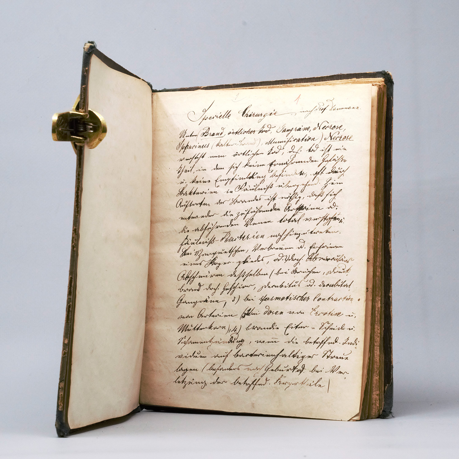 Schnemacher, B. Veterinärmedizinisches Vorlesungsskript. "Spezielle Chirurgie nach Prof. Laumann". 226 num. Bl., davon 10 Bl. vacat. 22-28 Zeilen. Mit schwarzbrauner Feder in Kurrent-Kursiva. Schriftraum: Ca. 17 x 13,5 cm. Format: 21 x 16,5 cm. Halbleinen d. Z. (Kapitale bestoßen, stärker berieben). Süddeutschland, wohl München 1881-1883.