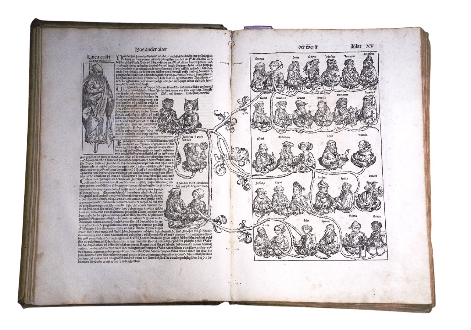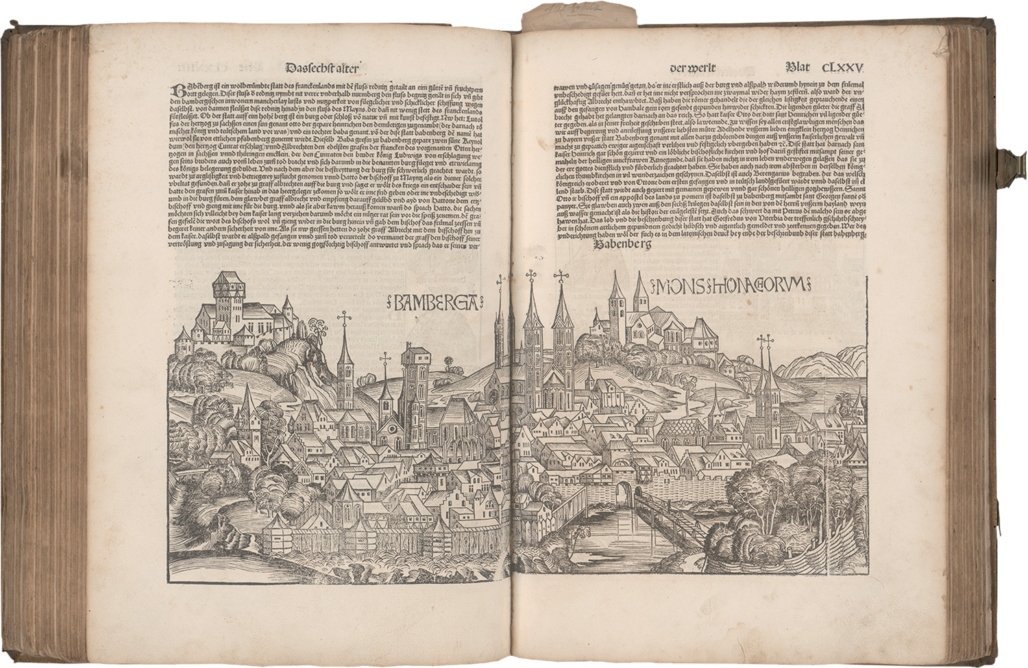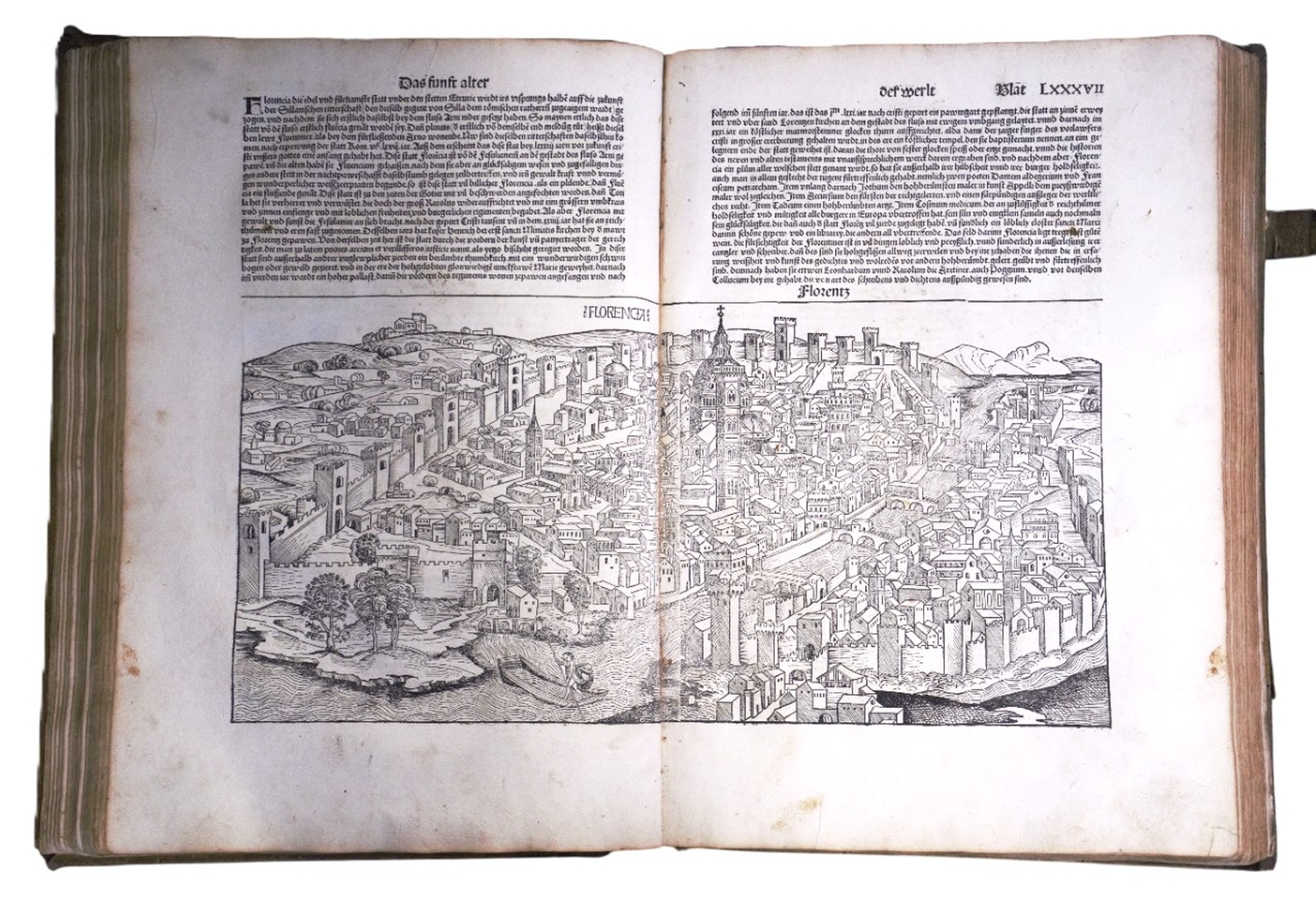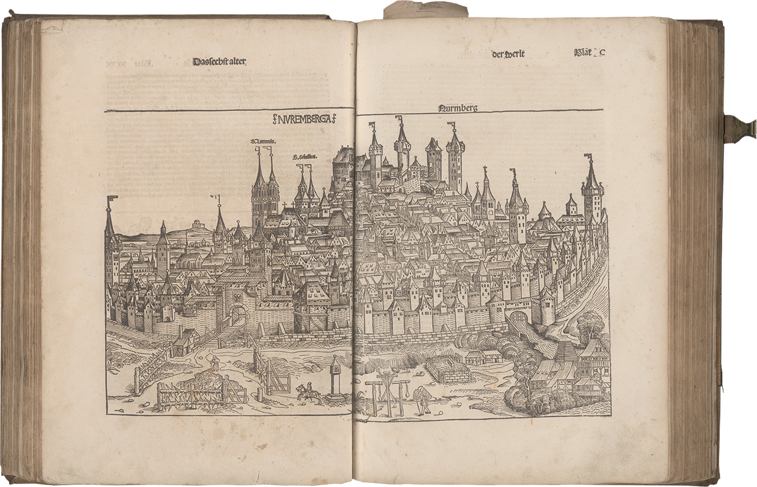 Hain 14510. GW 40796. Goff S-309. Proctor 2086. Pellechet 10354. Klebs 890.1. Schreiber 5205. Schramm XVII, 408-576. Bodleian S-110 Borm 2414. Bornatico 12. Collijn 966. Finger 870. 871. Günther 2071. Hubay 1861. Hummel-Wilhelmi 637. Schäfer 310. Kind 809. 810. Madsen 3637. Schlechter-Ries 1615-1619. Ohly-Sack 2530-2532. Raffel 438. Riedl 904. 905. Sack 3184. Sallander 1337b. Scheidegger-Tammaro 1206. Sheehan S-134. Voullième 1096. Walsh 734. 735. CBB 3471. CIH 3041. IBE 5181. IDL 4062. IGI 8830. BMC II, 437. BSB-Ink S-197 CIBN S-163. ISTC is00309000. – Erste deutsche Ausgabe des "Liber chronicarum", der berühmten Weltchronik des Nürnberger Humanisten, Historikers und Arztes Hartmann Schedel (1440-1514), die ein halbes Jahr nach der lateinischen Originalausgabe erschienen war. Es war das "größte Buchunternehmen der Zeit" (Rücker) und gehört zu den am umfangreichsten illustrierten Inkunabeln überhaupt. Die dafür verpflichteten Künstler Michael Wohlgemuth (1434-1519) und sein Schwiegersohn Wilhelm Pleydenwurff (1460-1494) kamen aus derselben Nürnberger Werkstatt, in der auch Albrecht Dürer ausgebildet worden war.