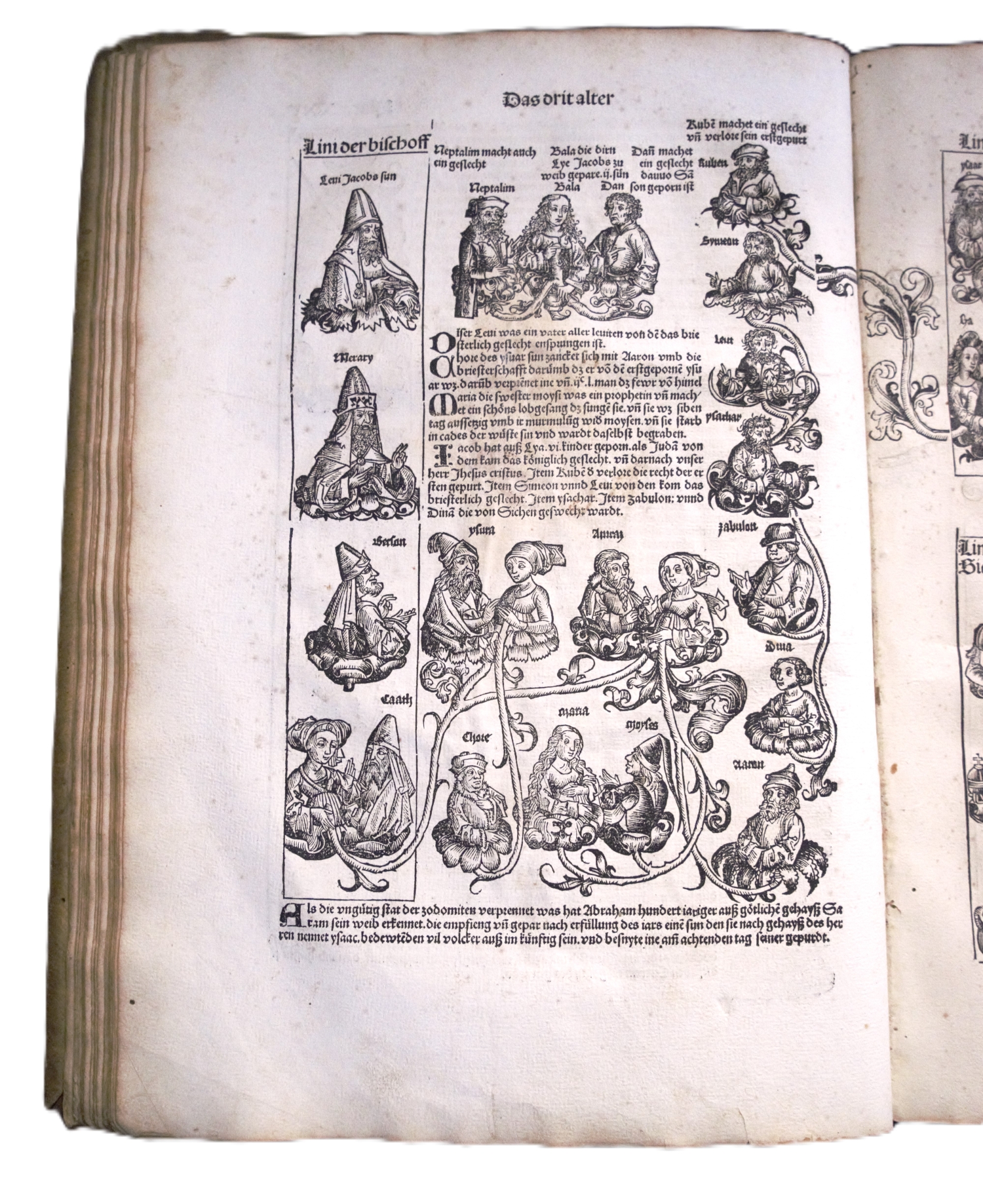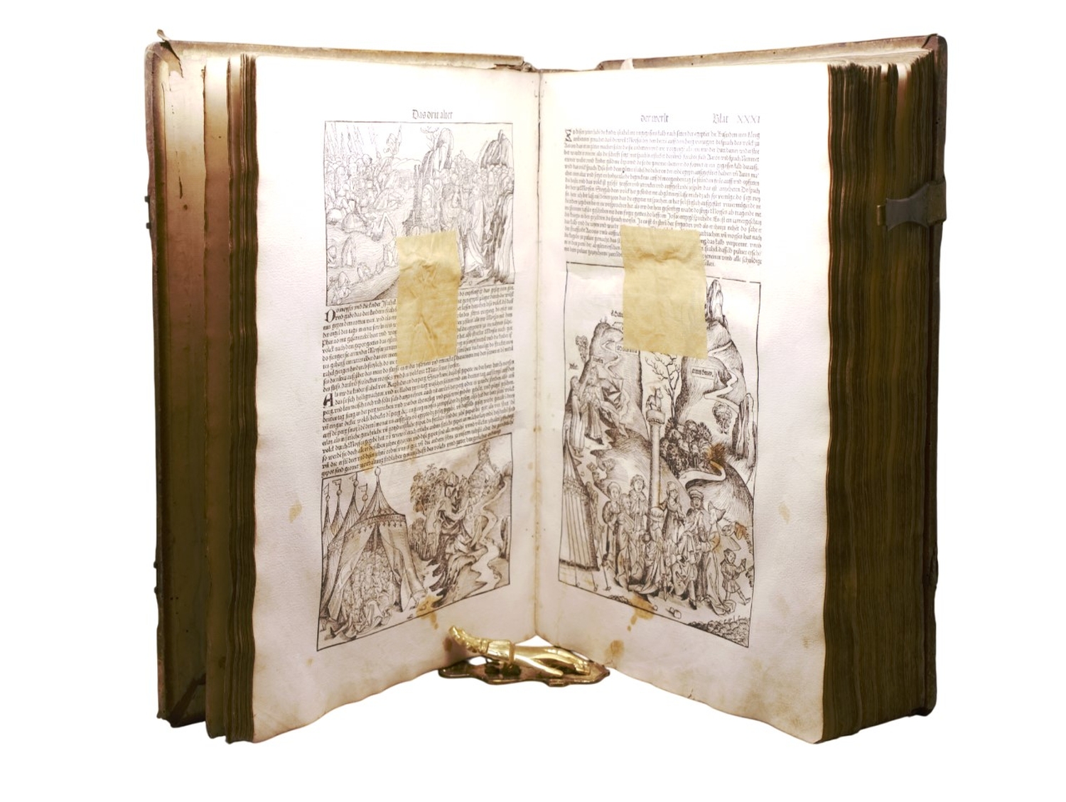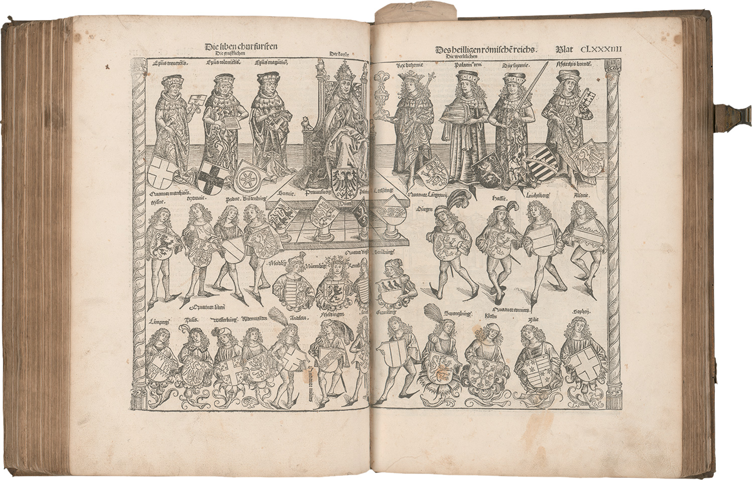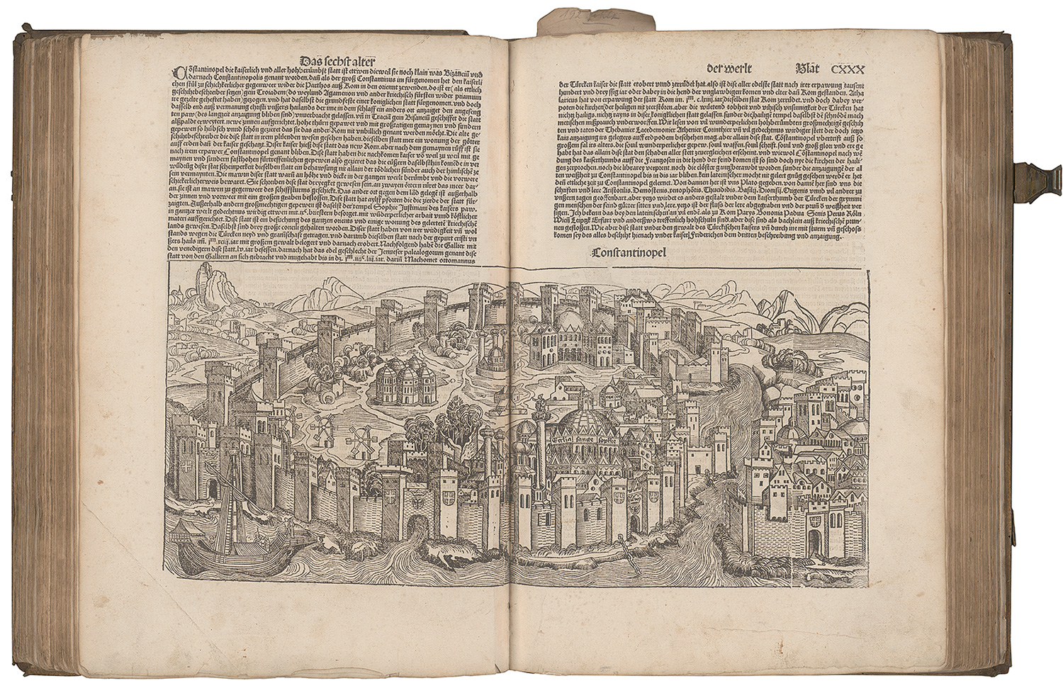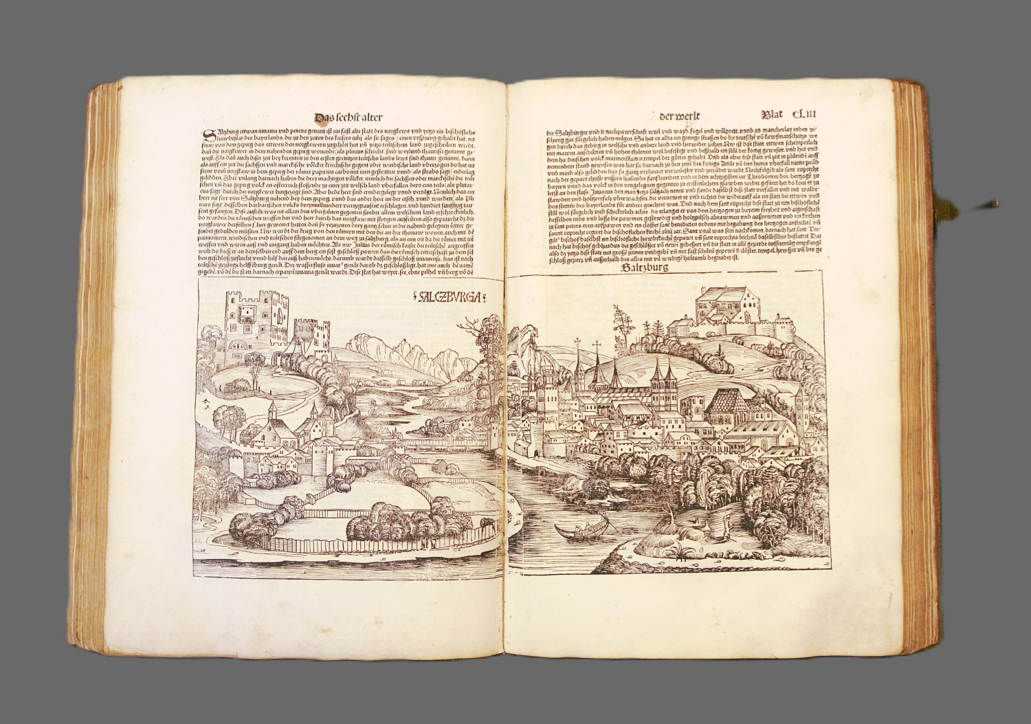 Hain 14510. GW 40796. Goff S-309. Proctor 2086. Pellechet 10354. Klebs 890.1. Schreiber 5205. Schramm XVII, 408-576. Bodleian S-110 Borm 2414. Bornatico 12. Collijn 966. Finger 870. 871. Günther 2071. Hubay 1861. Hummel-Wilhelmi 637. Schäfer 310. Kind 809. 810. Madsen 3637. Schlechter-Ries 1615-1619. Ohly-Sack 2530-2532. Raffel 438. Riedl 904. 905. Sack 3184. Sallander 1337b. Scheidegger-Tammaro 1206. Sheehan S-134. Voullième 1096. Walsh 734. 735. CBB 3471. CIH 3041. IBE 5181. IDL 4062. IGI 8830. BMC II, 437. BSB-Ink S-197 CIBN S-163. ISTC is00309000. – Erste deutsche Ausgabe des "Liber chronicarum", der berühmten Weltchronik des Nürnberger Humanisten, Historikers und Arztes Hartmann Schedel (1440-1514), die ein halbes Jahr nach der lateinischen Originalausgabe erschienen war. Es war das "größte Buchunternehmen der Zeit" (Rücker) und gehört zu den am umfangreichsten illustrierten Inkunabeln überhaupt. Die dafür verpflichteten Künstler Michael Wohlgemuth (1434-1519) und sein Schwiegersohn Wilhelm Pleydenwurff (1460-1494) kamen aus derselben Nürnberger Werkstatt, in der auch Albrecht Dürer ausgebildet worden war.