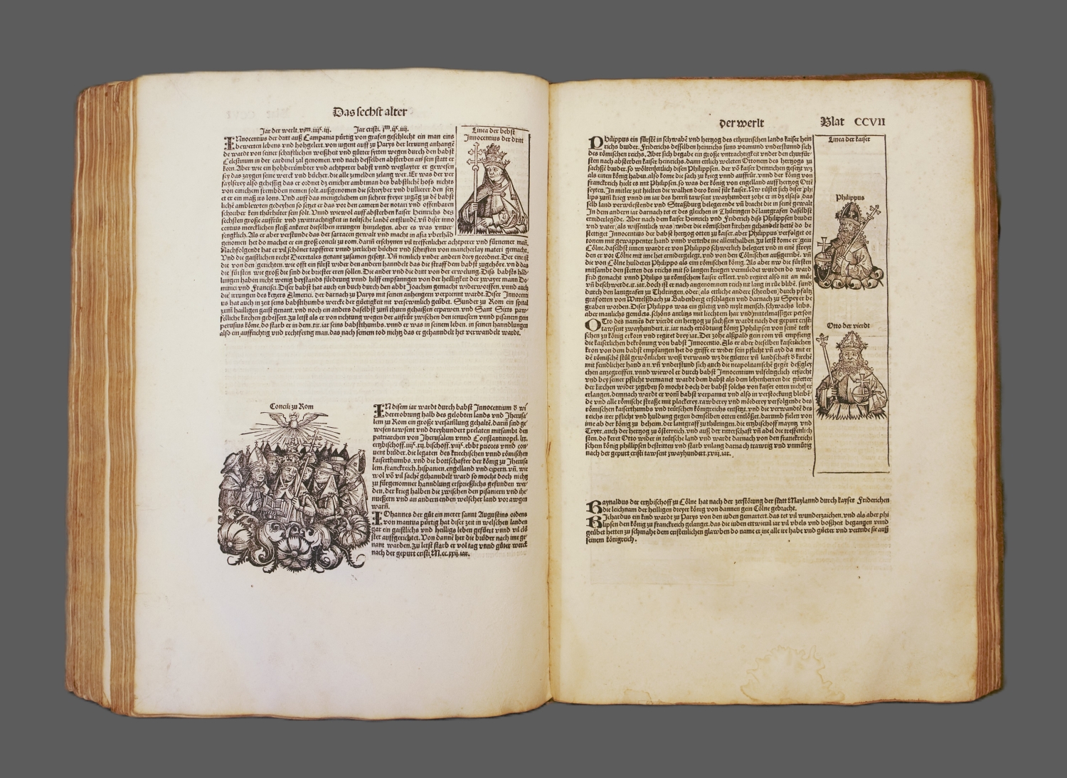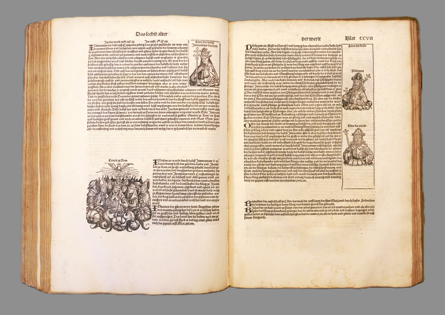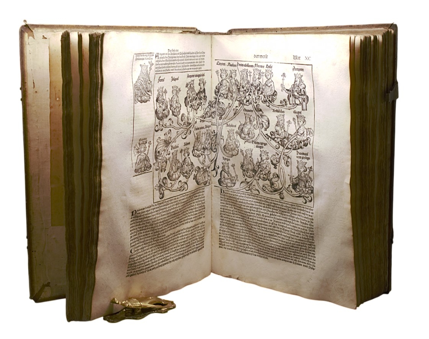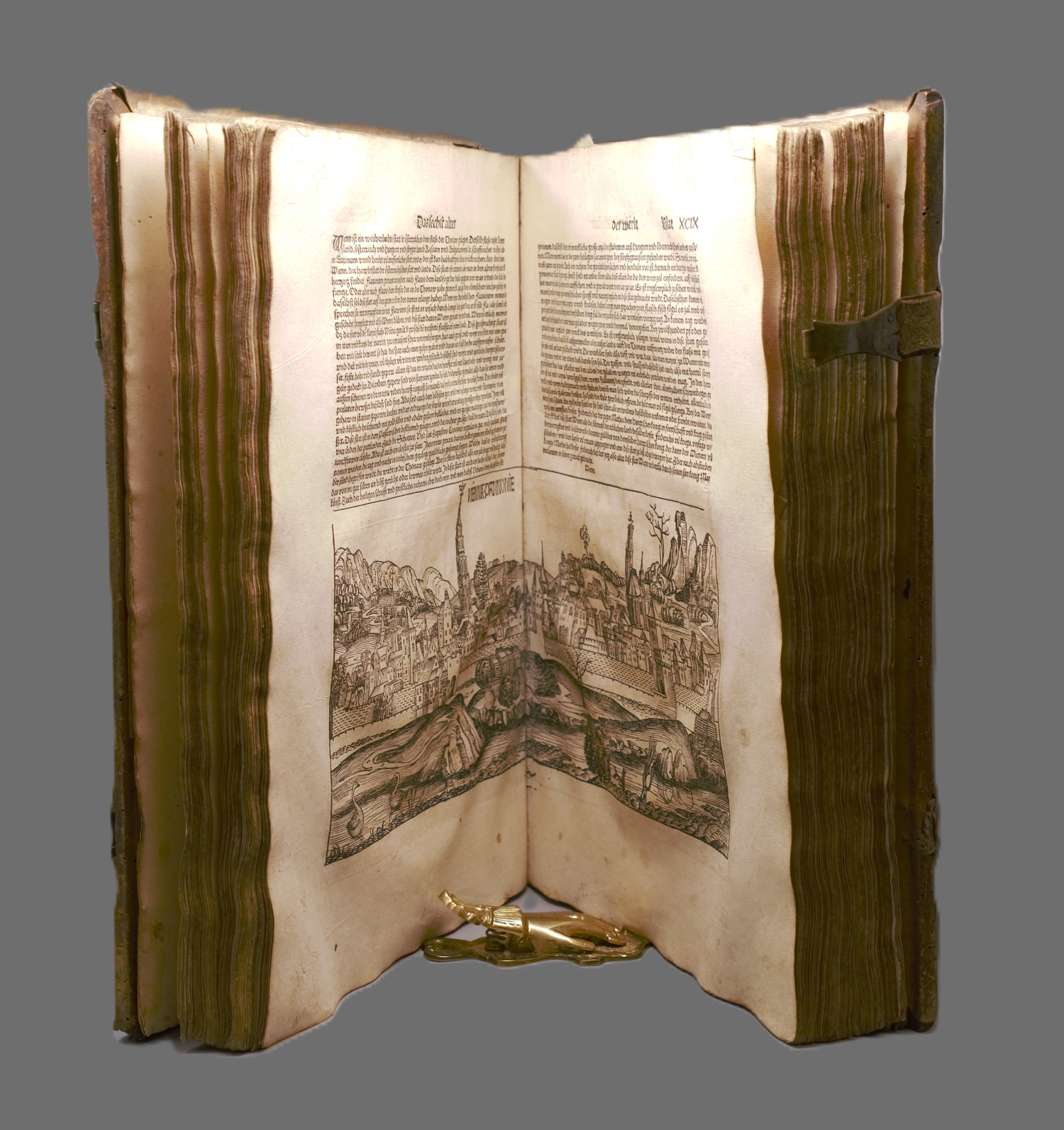 Hain 14510. GW 40796. Goff S-309. Proctor 2086. Pellechet 10354. Klebs 890.1. Schreiber 5205. Schramm XVII, 408-576. Bodleian S-110 Borm 2414. Bornatico 12. Collijn 966. Finger 870. 871. Günther 2071. Hubay 1861. Hummel-Wilhelmi 637. Schäfer 310. Kind 809. 810. Madsen 3637. Schlechter-Ries 1615-1619. Ohly-Sack 2530-2532. Raffel 438. Riedl 904. 905. Sack 3184. Sallander 1337b. Scheidegger-Tammaro 1206. Sheehan S-134. Voullième 1096. Walsh 734. 735. CBB 3471. CIH 3041. IBE 5181. IDL 4062. IGI 8830. BMC II, 437. BSB-Ink S-197 CIBN S-163. ISTC is00309000. – Erste deutsche Ausgabe des "Liber chronicarum", der berühmten Weltchronik des Nürnberger Humanisten, Historikers und Arztes Hartmann Schedel (1440-1514), die ein halbes Jahr nach der lateinischen Originalausgabe erschienen war. Es war das "größte Buchunternehmen der Zeit" (Rücker) und gehört zu den am umfangreichsten illustrierten Inkunabeln überhaupt. Die dafür verpflichteten Künstler Michael Wohlgemuth (1434-1519) und sein Schwiegersohn Wilhelm Pleydenwurff (1460-1494) kamen aus derselben Nürnberger Werkstatt, in der auch Albrecht Dürer ausgebildet worden war.