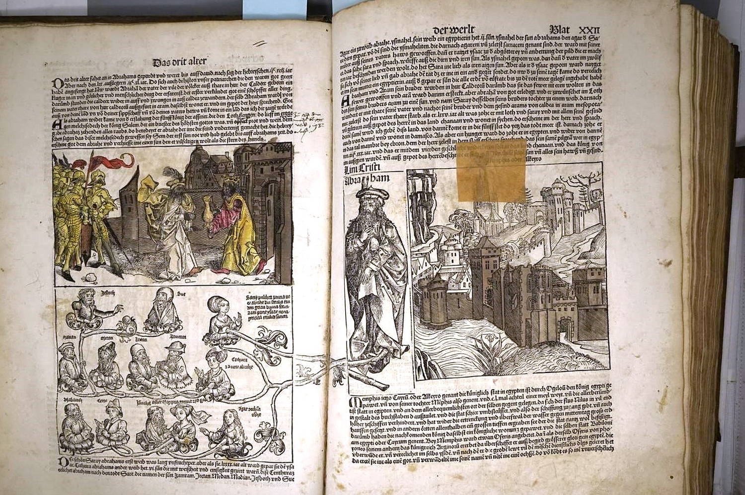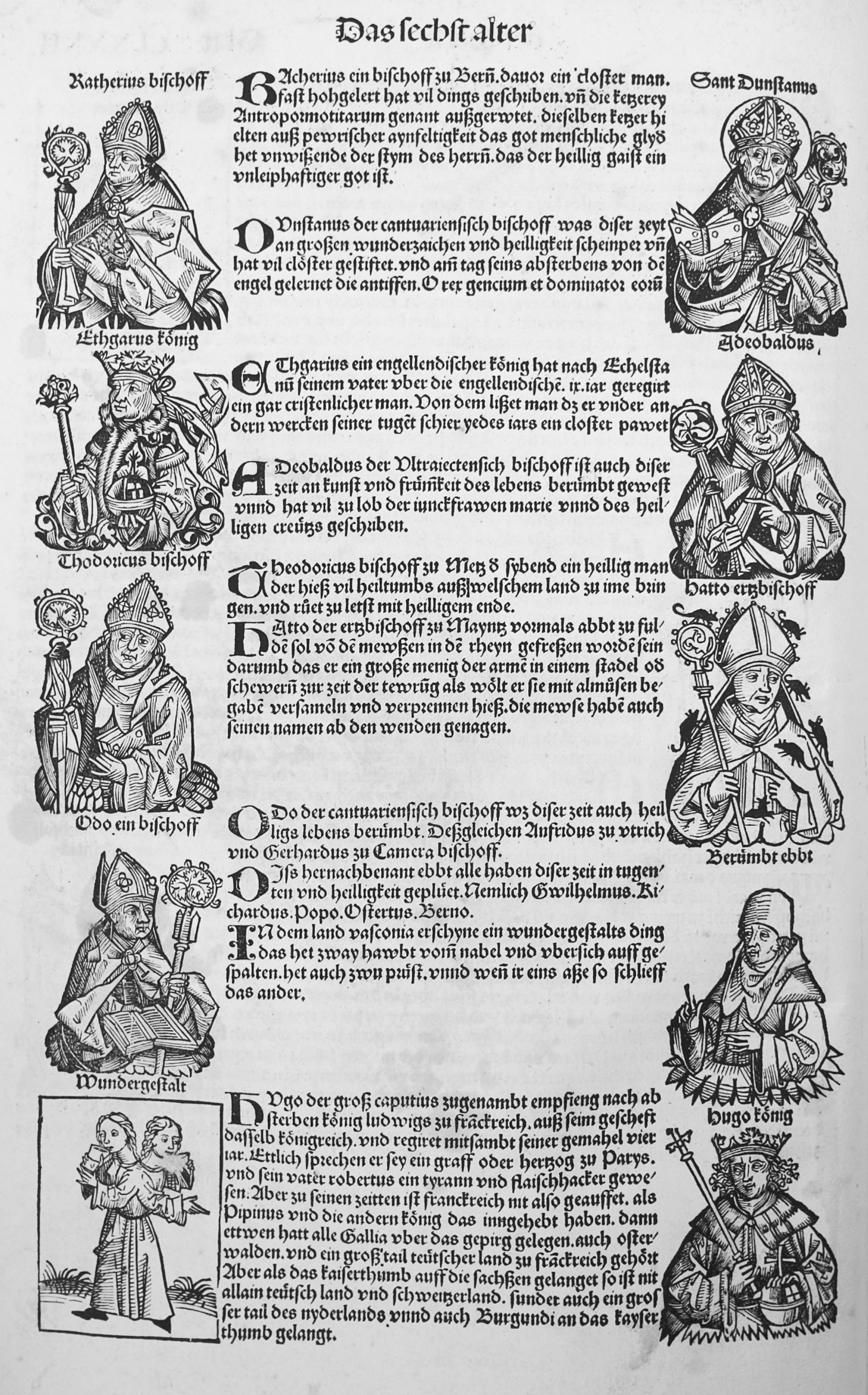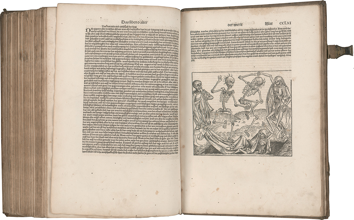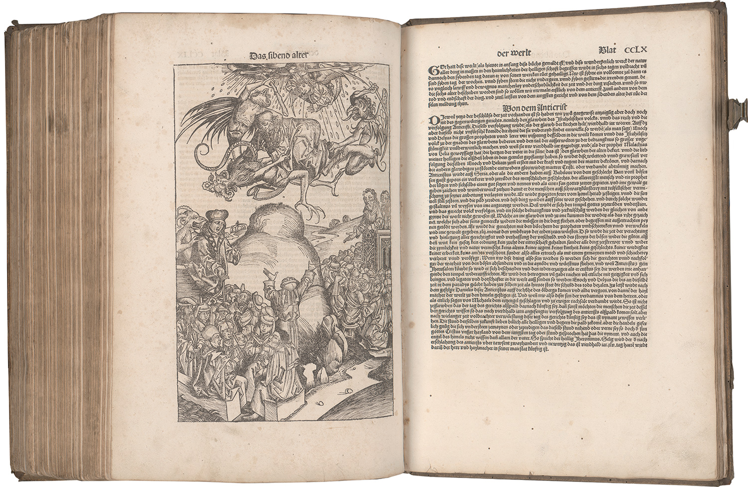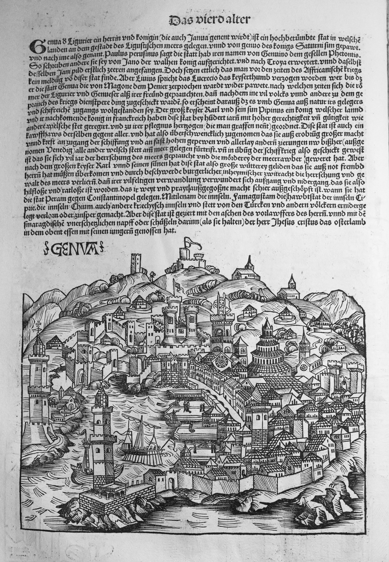 Hain 14510. GW 40796. Goff S-309. Proctor 2086. Pellechet 10354. Klebs 890.1. Schreiber 5205. Schramm XVII, 408-576. Bodleian S-110 Borm 2414. Bornatico 12. Collijn 966. Finger 870. 871. Günther 2071. Hubay 1861. Hummel-Wilhelmi 637. Schäfer 310. Kind 809. 810. Madsen 3637. Schlechter-Ries 1615-1619. Ohly-Sack 2530-2532. Raffel 438. Riedl 904. 905. Sack 3184. Sallander 1337b. Scheidegger-Tammaro 1206. Sheehan S-134. Voullième 1096. Walsh 734. 735. CBB 3471. CIH 3041. IBE 5181. IDL 4062. IGI 8830. BMC II, 437. BSB-Ink S-197 CIBN S-163. ISTC is00309000. – Erste deutsche Ausgabe des "Liber chronicarum", der berühmten Weltchronik des Nürnberger Humanisten, Historikers und Arztes Hartmann Schedel (1440-1514), die ein halbes Jahr nach der lateinischen Originalausgabe erschienen war. Es war das "größte Buchunternehmen der Zeit" (Rücker) und gehört zu den am umfangreichsten illustrierten Inkunabeln überhaupt. Die dafür verpflichteten Künstler Michael Wohlgemuth (1434-1519) und sein Schwiegersohn Wilhelm Pleydenwurff (1460-1494) kamen aus derselben Nürnberger Werkstatt, in der auch Albrecht Dürer ausgebildet worden war.